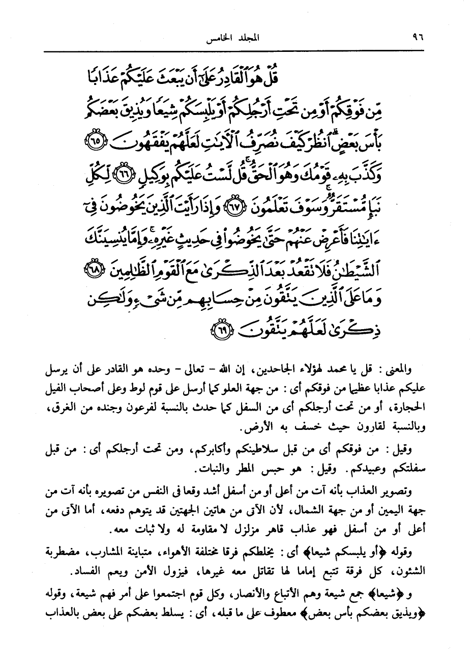 قُلْ هُوَ الْقادِرُ عَلى أَنْ يَبْعَثَ عَلَيْكُمْ عَذاباً مِنْ فَوْقِكُمْ أَوْ مِنْ تَحْتِ أَرْجُلِكُمْ أَوْ يَلْبِسَكُمْ شِيَعاً وَيُذِيقَ بَعْضَكُمْ بَأْسَ بَعْضٍ انْظُرْ كَيْفَ نُصَرِّفُ الْآياتِ لَعَلَّهُمْ يَفْقَهُونَ (65) وَكَذَّبَ بِهِ قَوْمُكَ وَهُوَ الْحَقُّ قُلْ لَسْتُ عَلَيْكُمْ بِوَكِيلٍ (66) لِكُلِّ نَبَإٍ مُسْتَقَرٌّ وَسَوْفَ تَعْلَمُونَ (67) وَإِذا رَأَيْتَ الَّذِينَ يَخُوضُونَ فِي آياتِنا فَأَعْرِضْ عَنْهُمْ حَتَّى يَخُوضُوا فِي حَدِيثٍ غَيْرِهِ وَإِمَّا يُنْسِيَنَّكَ الشَّيْطانُ فَلا تَقْعُدْ بَعْدَ الذِّكْرى مَعَ الْقَوْمِ الظَّالِمِينَ (68) وَما عَلَى الَّذِينَ يَتَّقُونَ مِنْ حِسابِهِمْ مِنْ شَيْءٍ وَلكِنْ ذِكْرى لَعَلَّهُمْ يَتَّقُونَ (69)