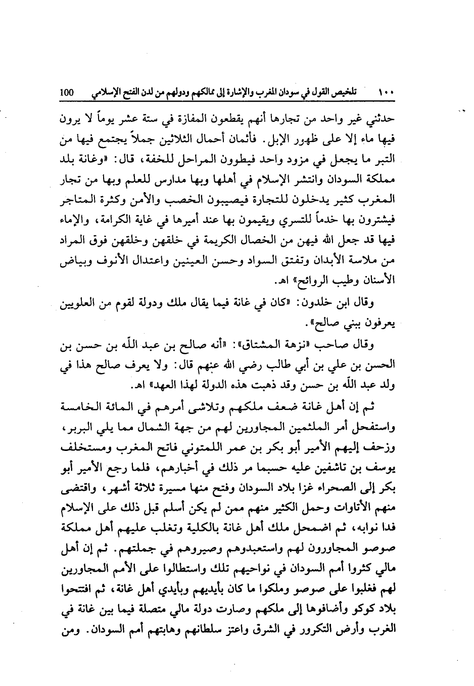 حَدثنِي غير وَاحِد من تجارها أَنهم يقطعون الْمَفَازَة فِي سِتَّة عشر يَوْمًا لَا يرَوْنَ فِيهَا مَاء إِلَّا على ظُهُور الْإِبِل فأثمان أحمال الثَّلَاثِينَ جملا يجْتَمع فِيهَا من التبر مَا يَجْعَل فِي مزود وَاحِد فيطوون المراحل للخفة قَالَ وغانة بلد مملكة السودَان وانتشر الْإِسْلَام فِي أَهلهَا وَبهَا مدارس للْعلم وَبهَا من تجار الْمغرب كثير يدْخلُونَ للتِّجَارَة فيصيبون الخصب والأمن وَكَثْرَة المتاجر فيشترون بهَا خدما للتسري ويقيمون بهَا عِنْد أميرها فِي غَايَة الْكَرَامَة وَالْإِمَاء فِيهَا قد جعل الله فِيهِنَّ من الْخِصَال الْكَرِيمَة فِي خَلقهنَّ وخلقهن فَوق المُرَاد من ملاسة الْأَبدَان وتفتق السوَاد وَحسن الْعَينَيْنِ واعتدال الأنوف وَبَيَاض الْأَسْنَان وَطيب الروائح اه