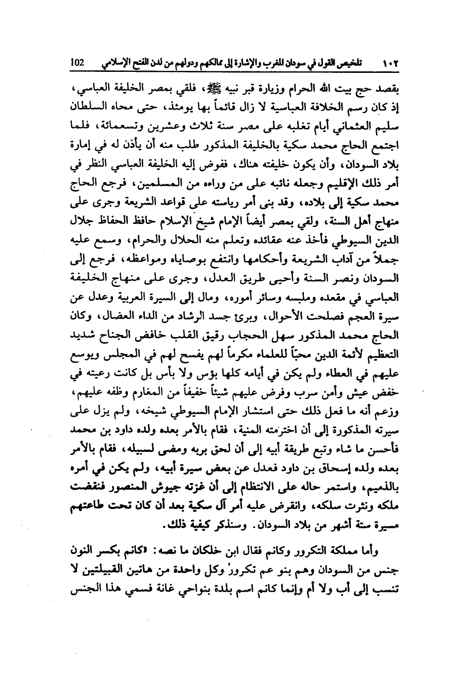 بِقصد حج بَيت الله الْحَرَام وزيارة قبر نبيه صلى الله عَلَيْهِ وَسلم فلقي بِمصْر الْخَلِيفَة العباسي إِذْ كَانَ رسم الْخلَافَة العباسة لَا زَالَ قَائِما بهَا يَوْمئِذٍ حَتَّى محاه السُّلْطَان سليم العثماني أَيَّام تغلبه على مصر سنة ثَلَاث وَعشْرين وَتِسْعمِائَة فَلَمَّا اجْتمع الْحَاج مُحَمَّد سكية بالخليفة الْمَذْكُور طلب مِنْهُ أَن يَأْذَن لَهُ فِي إِمَارَة بِلَاد السودَان وَأَن يكون خَلِيفَته هُنَاكَ ففوض إِلَيْهِ الْخَلِيفَة العباسي النّظر فِي أَمر ذَلِك الإقليم وَجعله نَائِبه على من وَرَاءه من الْمُسلمين فَرجع الْحَاج مُحَمَّد سكية إِلَى بِلَاده وَقد بنى أَمر رياسته على قَوَاعِد الشَّرِيعَة وَجرى على منهاج أهل السّنة وَلَقي بِمصْر أَيْضا الإِمَام شيخ الْإِسْلَام حَافظ الْحفاظ جلال الدّين السُّيُوطِيّ فَأخذ عَنهُ عقائده وَتعلم مِنْهُ الْحَلَال وَالْحرَام وَسمع عَلَيْهِ جملا من آدَاب الشَّرِيعَة وأحكامها وانتفع بوصاياه ومواعظه فَرجع إِلَى السودَان وَنصر السّنة وأحيى طَرِيق الْعدْل وَجرى على منهاج الْخَلِيفَة العباسي فِي مَقْعَده وملبسه وَسَائِر أُمُوره وَمَال إِلَى السِّيرَة الْعَرَبيَّة وَعدل عَن سيرة الْعَجم فصلحت الْأَحْوَال وَبرئ جَسَد الرشاد من الدَّاء العضال وَكَانَ الْحَاج مُحَمَّد الْمَذْكُور سهل الْحجاب رَقِيق الْقلب خافض الْجنَاح شَدِيد التَّعْظِيم لأئمة الدّين محبا للْعُلَمَاء مكرما لَهُم يفسح لَهُم فِي الْمجْلس ويوسع عَلَيْهِم فِي الْعَطاء وَلم يكن فِي أَيَّامه كلهَا بؤس وَلَا بَأْس بل كَانَت رَعيته فِي خفض عَيْش وَأمن سرب وَفرض عَلَيْهِم شَيْئا خَفِيفا من المغارم وظفه عَلَيْهِم وَزعم أَنه مَا فعل ذَلِك حَتَّى اسْتَشَارَ الإِمَام السُّيُوطِيّ شَيْخه وَلم يزل على سيرته الْمَذْكُورَة إِلَى أَن اخترمته الْمنية فَقَامَ بِالْأَمر بعده وَلَده دَاوُد بن مُحَمَّد فَأحْسن مَا شَاءَ وَتبع طَريقَة أَبِيه إِلَى أَن لحق بربه وَمضى لسبيله فَقَامَ بِالْأَمر بعده وَلَده إِسْحَاق بن دَاوُد فَعدل عَن بعض سيرة أَبِيه وَلم يكن فِي أمره بالذميم وَاسْتمرّ حَاله على الانتظام إِلَى أَن غزته جيوش الْمَنْصُور فنقضت ملكه وَنَثَرت سلكه وانقرض عَلَيْهِ أَمر آل سكية بعد أَن كَانَ تَحت طاعتهم مسيرَة سِتَّة أشهر من بِلَاد السودَان وَسَنذكر كَيْفيَّة ذَلِك