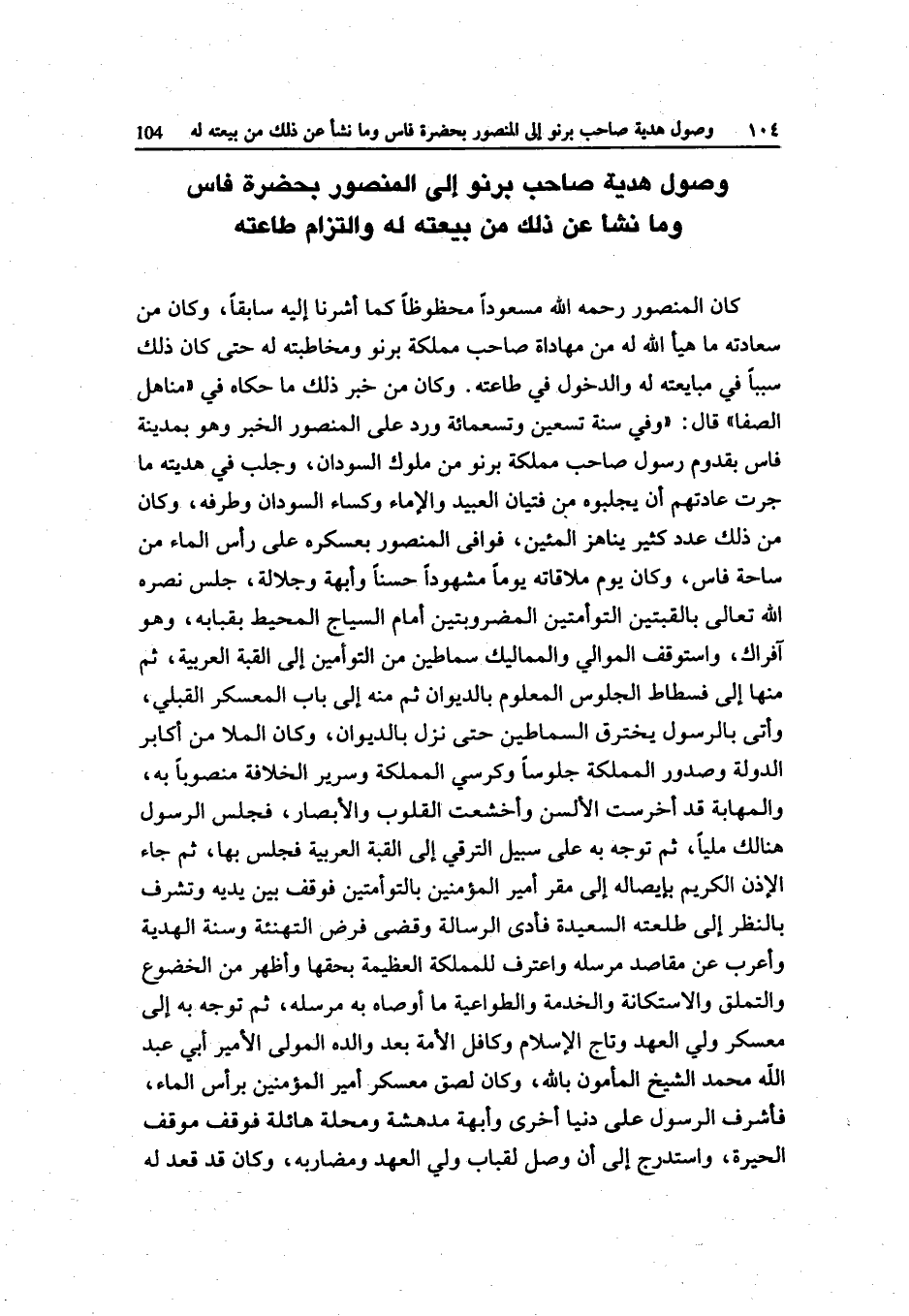 وُصُول هَدِيَّة صَاحب برنو إِلَى الْمَنْصُور بِحَضْرَة فاس وَمَا نَشأ عَن ذَلِك من بيعَته لَهُ والتزام طَاعَته