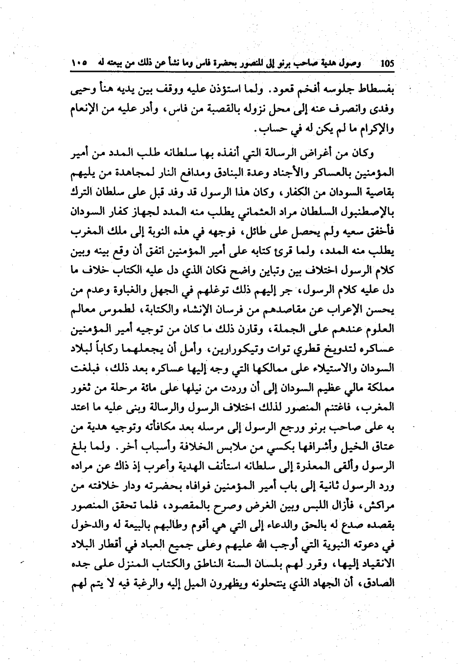وَكَانَ من أغراض الرسَالَة الَّتِي أنفذه بهَا سُلْطَانه طلب المدد من أَمِير الْمُؤمنِينَ بالعساكر والأجناد وعدة البنادق ومدافع النَّار لمجاهدة من يليهم بقاصية السودَان من الْكفَّار وَكَانَ هَذَا الرَّسُول قد وَفد قبل على سُلْطَان التّرْك بالإصطنبول السُّلْطَان مُرَاد العثماني يطْلب مِنْهُ المدد لجهاز كفار السودَان فأخفق سَعْيه وَلم يحصل على طائل فوجهه فِي هَذِه النّوبَة إِلَى ملك الْمغرب يطْلب مِنْهُ المدد وَلما قرئَ كِتَابه على أَمِير الْمُؤمنِينَ اتّفق أَن وَقع بَينه وَبَين كَلَام الرَّسُول اخْتِلَاف بَين وتباين وَاضح فَكَانَ الَّذِي دلّ عَلَيْهِ الْكتاب خلاف مَا دلّ عَلَيْهِ كَلَام الرَّسُول جر إِلَيْهِم ذَلِك توغلهم فِي الْجَهْل والغباوة وَعدم من يحسن الْإِعْرَاب عَن مقاصدهم من فرسَان الْإِنْشَاء وَالْكِتَابَة لطموس معالم الْعُلُوم عِنْدهم على الْجُمْلَة وقارن ذَلِك مَا كَانَ من تَوْجِيه أَمِير الْمُؤمنِينَ عساكره لتدويخ قطري توات وتيكورارين وأمل أَن يجعلهما ركابا لبلاد السودَان والاستيلاء على ممالكها الَّتِي وَجه إِلَيْهَا عساكره بعد ذَلِك فبلغت مملكة مَالِي عَظِيم السودَان إِلَى أَن وَردت من نيلها على مَائه مرحلة من ثغور الْمغرب فاغتنم الْمَنْصُور لذَلِك اخْتِلَاف الرَّسُول والرسالة وَبنى عَلَيْهِ مَا اعْتد بِهِ على صَاحب برنو وَرجع الرَّسُول إِلَى مرسله بعد مكافأته وتوجيه هَدِيَّة من عتاق الْخَيل وأشرافها بكسي من ملابس الْخلَافَة وَأَسْبَاب أخر وَلما بلغ الرَّسُول وَألقى المعذرة إِلَى سُلْطَانه اسْتَأْنف الْهَدِيَّة وأعرب إِذْ ذَاك عَن مُرَاده ورد الرَّسُول ثَانِيَة إِلَى بَاب أَمِير الْمُؤمنِينَ فوافاه بِحَضْرَتِهِ وَدَار خِلَافَته من مراكش فأزال اللّبْس وَبَين الْغَرَض وَصرح بِالْمَقْصُودِ فَلَمَّا تحقق الْمَنْصُور بِقَصْدِهِ صدع لَهُ بِالْحَقِّ وَالدُّعَاء إِلَى الَّتِي هِيَ أقوم وطالبهم بالبيعة لَهُ وَالدُّخُول فِي دَعوته النَّبَوِيَّة الَّتِي أوجب الله عَلَيْهِم وعَلى جَمِيع الْعباد فِي أقطار الْبِلَاد الانقياد إِلَيْهَا وَقرر لَهُم بِلِسَان السّنة النَّاطِق وَالْكتاب الْمنزل على جده الصَّادِق أَن الْجِهَاد الَّذِي ينتحلونه ويظهرون الْميل إِلَيْهِ وَالرَّغْبَة فِيهِ لَا يتم لَهُم