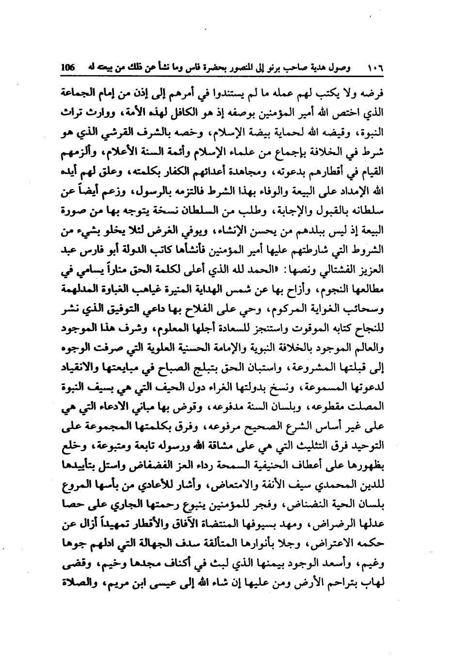فَرْضه وَلَا يكْتب لَهُم علمه مَا لم يستندوا فِي أَمرهم إِلَى إِذن من إِمَام الْجَمَاعَة الَّذِي اخْتصَّ الله أَمِير الْمُؤمنِينَ بوصفه إِذْ هُوَ الكافل لهَذِهِ الْأمة ووارث تراث النُّبُوَّة وقيضه الله لحماية بَيْضَة الْإِسْلَام وَخَصه بالشرف الْقرشِي الَّذِي هُوَ شَرط فِي الْخلَافَة بِإِجْمَاع من عُلَمَاء الْإِسْلَام وأئمة السّنة الْأَعْلَام وألزمهم الْقيام فِي أقطارهم بدعوته ومجاهدة أعدائهم الْكفَّار بكلمته وعلق لَهُم أيده الله الْإِمْدَاد على الْبيعَة وَالْوَفَاء بِهَذَا الشَّرْط فَالْتَزمهُ بالرسول وَزعم أَيْضا عَن سُلْطَانه بِالْقبُولِ والإجابة وَطلب من السُّلْطَان نُسْخَة يتَوَجَّه بهَا من صُورَة الْبيعَة إِذْ لَيْسَ ببلدهم من يحسن الْإِنْشَاء ويوفي الْغَرَض لِئَلَّا يَخْلُو بِشَيْء من الشُّرُوط الَّتِي شارطتهم عَلَيْهَا أَمِير الْمُؤمنِينَ فأنشأها كَاتب الدولة أَبُو فَارس عبد الْعَزِيز الفشتالي وَنَصهَا الْحَمد الله الَّذِي أَعلَى لكلمة الْحق منارا يسامي فِي مطالعها النُّجُوم وأزاح بهَا عَن شمس الْهِدَايَة المنيرة غياهب الغباوة المدلهمة وسحائب الغواية المركوم وَحي على الْفَلاح بهَا دَاعِي التَّوْفِيق الَّذِي نشر للنجاح كِتَابه الموقوت واستنجز للسعادة أجلهَا الْمَعْلُوم وَشرف هَذَا الْمَوْجُود والعالم الْمَوْجُود بالخلافة النَّبَوِيَّة والإمامة الحسنية العلوية الَّتِي صرفت الْوُجُوه إِلَى قبلتها الْمَشْرُوعَة واستبان الْحق بتبلج الصَّباح فِي مبايعتها والانقياد لدعوتها المسموعة وَنسخ بدولتها الغراء دوَل الحيف الَّتِي هِيَ بِسيف النُّبُوَّة المصلت مقطوعه وبلسان السّنة مدفوعه وقوض بهَا مباني الادعاء الَّتِي هِيَ على غير أساس الشَّرْع الصَّحِيح مدفوعه وَفرق بكلمتها الْمَجْمُوعَة على التَّوْحِيد فرق التَّثْلِيث الَّتِي هِيَ على مشاقة الله وَرَسُوله تَابِعَة ومتبوعة وخلع بظهورها على أعطاف الحنيفية السمحة رِدَاء الْعِزّ الفضفاض واستل بتأييدها للدّين المحمدي سيف الأنفة والامتعاض وَأَشَارَ للأعادي من بأسها المروع بِلِسَان الْحَيَّة النضناض وفجر للْمُؤْمِنين ينبوع رحمتها الْجَارِي على حصا عدلها الرضراض ومهد بسيوفها المنتضاة الْآفَاق والأقطار تمهيدا أَزَال عَن حكمه الِاعْتِرَاض وجلا بأنوارها المتألقة سدف الْجَهَالَة الَّتِي ادلهم جوها وغيم وأسعد الْوُجُود بيمنها الَّذِي لبث فِي أكناف مجدها وخيم وَقضى لهاب بتراحم الأَرْض وَمن عَلَيْهَا إِن شَاءَ الله إِلَى عِيسَى ابْن مَرْيَم وَصلى الله عَلَيْهِ وَسلم