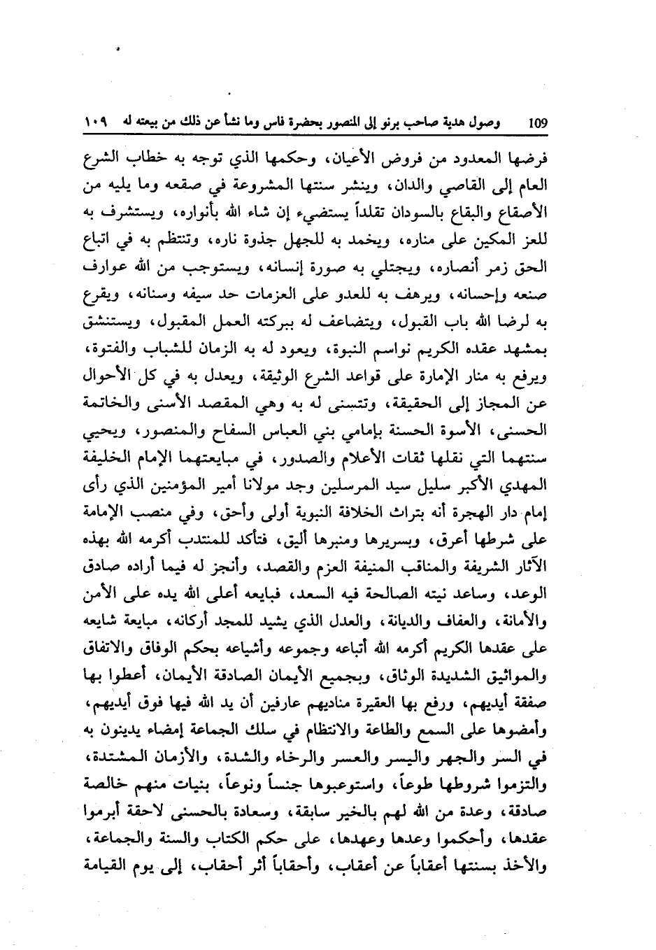 فَرضهَا الْمَعْدُود من فروض الْأَعْيَان وَحكمهَا الَّذِي توجه بِهِ خطاب الشَّرْع الْعَام إِلَى القاصي والدان وينشر سنتها الْمَشْرُوعَة فِي صقعه وَمَا يَلِيهِ من الأصقاع وَالْبِقَاع بالسودان تقلدا يستضيء إِن شَاءَ الله بأنواره ويستشرف بِهِ للعز المكين على مناره ويخمد بِهِ للْجَهْل جذوة ناره وتنتظم بِهِ فِي اتِّبَاع الْحق زمر أنصاره ويجتلي بِهِ صُورَة إنسانه ويستوجب من الله عوارف صنعه وإحسانه ويرهف بِهِ لِلْعَدو على العزمات حد سَيْفه وسنانه ويقرع بِهِ لرضا الله بَاب الْقبُول ويتضاعف لَهُ ببركته الْعَمَل المقبول ويستنشق بمشهد عقده الْكَرِيم نواسم النُّبُوَّة وَيعود لَهُ بِهِ الزَّمَان للشباب والفتوة وَيرْفَع بِهِ منار الْإِمَارَة على قَوَاعِد الشَّرْع الْوَثِيقَة ويعدل بِهِ فِي كل الْأَحْوَال عَن الْمجَاز إِلَى الْحَقِيقَة وتتسنى لَهُ بِهِ وَهِي الْمَقْصد الْأَسْنَى والخاتمة الْحسنى الأسوة الْحَسَنَة بإمامي بني الْعَبَّاس السفاح والمنصور وَيحيى سنتهما الَّتِي نقلهَا ثِقَات الْأَعْلَام والصدور فِي مبايعتهما الإِمَام الْخَلِيفَة الْمهْدي الْأَكْبَر سليل سيد الْمُرْسلين وجد مَوْلَانَا أَمِير الْمُؤمنِينَ الَّذِي رأى إِمَام دَار الْهِجْرَة أَنه بتراث الْخلَافَة النَّبَوِيَّة أولى وأحق وَفِي منصب الْإِمَامَة على شَرطهَا أعرق وبسريرها ومنبرها أليق فتأكد للمنتدب أكْرمه الله بِهَذِهِ الْآثَار الشَّرِيفَة والمناقب المنيفة الْعَزْم وَالْقَصْد وأنجز لَهُ فِيمَا أَرَادَهُ صَادِق الْوَعْد وساعد نِيَّته الصَّالِحَة فِيهِ السعد فَبَايعهُ أَعلَى الله يَده على الْأَمْن وَالْأَمَانَة والعفاف والديانة وَالْعدْل الَّذِي يشيد للمجد أَرْكَانه مبايعة شايعه على عقدهَا الْكَرِيم أكْرمه الله أَتْبَاعه وجموعه وأشياعه بِحكم الْوِفَاق والاتفاق والمواثيق الشَّدِيدَة الوثاق وبجميع الْأَيْمَان الصادقة الْأَيْمَان أعْطوا بهَا صَفْقَة أَيْديهم وَرفع بهَا العقيرة مناديهم عارفين أَن يَد الله فِيهَا فَوق أَيْديهم وأمضوها على السّمع وَالطَّاعَة والانتظام فِي سلك الْجَمَاعَة إِمْضَاء يدينون بِهِ فِي السِّرّ والجهر واليسر والعسر والرخاء والشدة والأزمان المشتدة والتزموا شُرُوطهَا طَوْعًا واستوعبوها جِنْسا ونوعا بنيات مِنْهُم خَالِصَة صَادِقَة وعدة من الله لَهُم بِالْخَيرِ سَابِقَة وسعادة بِالْحُسْنَى لاحقة أبرموا عقدهَا وأحكموا وعدها وعهدها على حكم الْكتاب وَالسّنة وَالْجَمَاعَة وَالْأَخْذ بسنتها أعقابا من أعقاب وأحقابا أثر أحقاب إِلَى يَوْم الْقِيَامَة