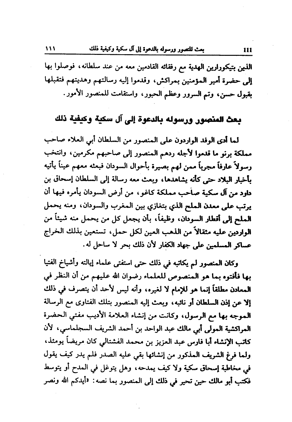 وَكَانَ الْمَنْصُور لم يكاتبه فِي ذَلِك حَتَّى أستفتى عُلَمَاء إيالته وأشياخ الْفتيا بهَا فأفتوه بِمَا هُوَ الْمَنْصُوص للْعُلَمَاء رضوَان الله عَلَيْهِم من أَن النّظر فِي الْمَعَادِن مُطلقًا إِنَّمَا هُوَ للْإِمَام لَا لغيره وَأَنه لَيْسَ لأحد أَن يتَصَرَّف فِي ذَلِك إِلَّا عَن إِذن السُّلْطَان أَو نَائِبه وَبعث إِلَيْهِ الْمَنْصُور بِتِلْكَ الْفَتَاوَى مَعَ الرسَالَة الموجه بهَا مَعَ الرَّسُول وَكَانَت من إنْشَاء الْعَلامَة الأديب مفتي الحضرة المراكشية الْمولى أبي مَالك عبد الْوَاحِد بن أَحْمد الشريف السجلماسي لِأَن كَاتب الْإِنْشَاء أَبَا فَارس عبد الْعَزِيز بن مُحَمَّد الفشتالي كَانَ مَرِيضا يَوْمئِذٍ وَلما فرغ الشريف الْمَذْكُور من إنشائها بَقِي عَلَيْهِ الصَّدْر فَلم يدر كَيفَ يَقُول فِي مُخَاطبَة إِسْحَاق سكية وَلَا كَيفَ يمدحه وَهل يتوغل فِي الْمَدْح أَو يتوسط فَكتب أَبُو مَالك حِين تحير فِي ذَلِك إِلَى الْمَنْصُور بِمَا نَصه أيدكم الله وَنصر