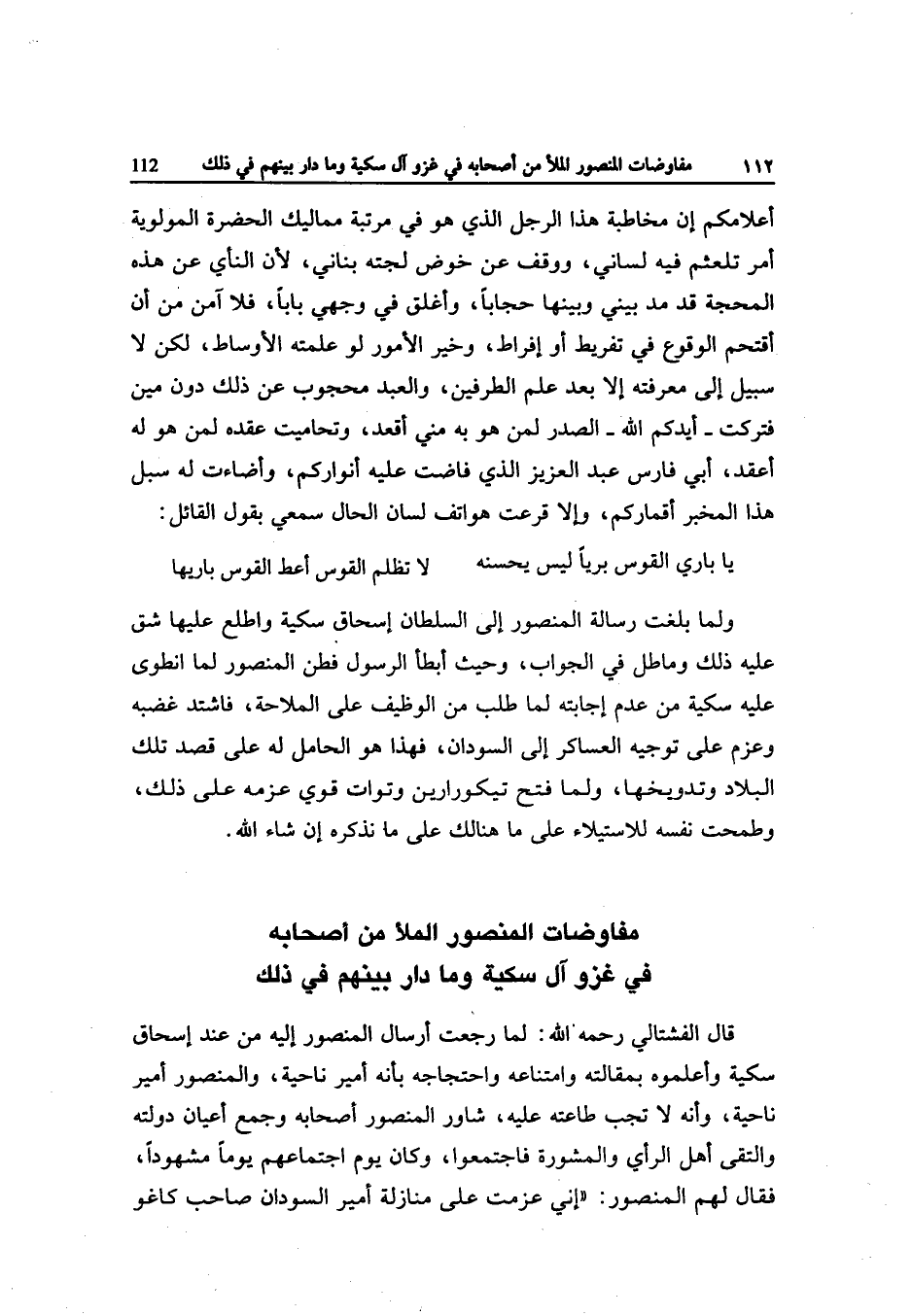 قَالَ الفشتالي رَحمَه الله لما رجعت أرسال الْمَنْصُور إِلَيْهِ من عِنْد إِسْحَاق سكية وأعلموه بمقالته وامتناعه واحتجاجه بِأَنَّهُ أَمِير نَاحيَة والمنصور أَمِير نَاحيَة وَأَنه لَا تجب طَاعَته عَلَيْهِ شاور الْمَنْصُور أَصْحَابه وَجمع أَعْيَان دولته والتقى أهل الرَّأْي والمشورة فَاجْتمعُوا وَكَانَ يَوْم اجْتِمَاعهم يَوْمًا مشهودا فَقَالَ لَهُم الْمَنْصُور إِنِّي عزمت على منازلة أَمِير السودَان صَاحب كاغو