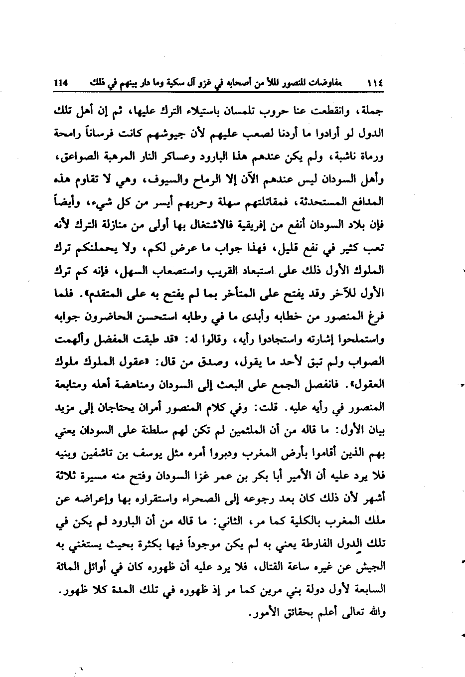 جملَة وانقطعت عَنَّا حروب تلمسان باستيلاء التّرْك عَلَيْهَا ثمَّ إِن أهل تِلْكَ الدول لَو أَرَادوا مَا أردنَا لصعب عَلَيْهِم لِأَن جيوشهم كَانَت فُرْسَانًا رامحة ورماة ناشبة وَلم يكن عِنْدهم هَذَا البارود وعساكر النَّار المرهبة الصَّوَاعِق وَأهل السودَان لَيْسَ عِنْدهم الْآن إِلَّا الرماح وَالسُّيُوف وَهِي لَا تقاوم هَذِه المدافع المستحدثة فمقاتلتهم سهلة وحربهم أيسر من كل شَيْء وَأَيْضًا فَإِن بِلَاد السودَان أَنْفَع من إفريقية فالاشتغال بهَا أولى من منازلة التّرْك لِأَنَّهُ تَعب كثير فِي نفع قَلِيل فَهَذَا جَوَاب مَا عرض لكم وَلَا يحملنكم ترك الْمُلُوك الأول ذَلِك على استبعاد الْقَرِيب واستصعاب السهل فَإِنَّهُ كم ترك الأول للْآخر وَقد يفتح على الْمُتَأَخر بِمَا لم يفتح بِهِ على الْمُتَقَدّم فَلَمَّا فرغ الْمَنْصُور من خطابه وَأبْدى مَا فِي وطابه اسْتحْسنَ الْحَاضِرُونَ جَوَابه واستملحوا إِشَارَته واستجادوا رَأْيه وَقَالُوا لَهُ قد طبقت الْمفضل وألهمت الصَّوَاب وَلم تبْق لأحد مَا يَقُول وَصدق من قَالَ عقول الْمُلُوك مُلُوك الْعُقُول فانفصل الْجمع على الْبَعْث إِلَى السودَان ومناهضة أَهله ومتابعة الْمَنْصُور فِي رَأْيه عَلَيْهِ قلت وَفِي كَلَام الْمَنْصُور أَمْرَانِ يحتاجان إِلَى مزِيد بَيَان الأول مَا قَالَه من أَن الملثمين لم تكن لَهُم سلطنة على السودَان يَعْنِي بهم الَّذين أَقَامُوا بِأَرْض الْمغرب ودبروا أمره مثل يُوسُف بن تاشفين وبنيه فَلَا يرد عَلَيْهِ أَن الْأَمِير أَبَا بكر بن عمر غزا السودَان وَفتح مِنْهُ مسيرَة ثَلَاثَة أشهر لِأَن ذَلِك كَانَ بعد رُجُوعه إِلَى الصَّحرَاء واستقراره بهَا وإعراضه عَن ملك الْمغرب بِالْكُلِّيَّةِ كَمَا مر الثَّانِي مَا قَالَه من أَن البارود لم يكن فِي تِلْكَ الدول الفارطة يَعْنِي بِهِ لم يكن مَوْجُودا فِيهَا بِكَثْرَة بِحَيْثُ يَسْتَغْنِي بِهِ الْجَيْش عَن غَيره سَاعَة الْقِتَال فَلَا يرد عَلَيْهِ أَن ظُهُوره كَانَ فِي أَوَائِل الْمِائَة السَّابِعَة لأوّل دولة بني مرين كَمَا مر إِذْ ظُهُوره فِي تِلْكَ الْمدَّة كلا ظُهُور وَالله تَعَالَى أعلم بحقائق الْأُمُور