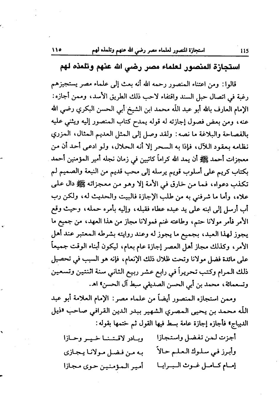وَمِمَّنْ استجازه الْمَنْصُور أَيْضا من عُلَمَاء مصر الإِمَام الْعَلامَة أَبُو عبد الله مُحَمَّد بن يحيى الْمصْرِيّ الشهير ببدر الدّين الْقَرَافِيّ صَاحب ذيل الديباج فَأَجَازَهُ إجَازَة عَامَّة بسط فِيهَا القَوْل ثمَّ خَتمهَا بقوله