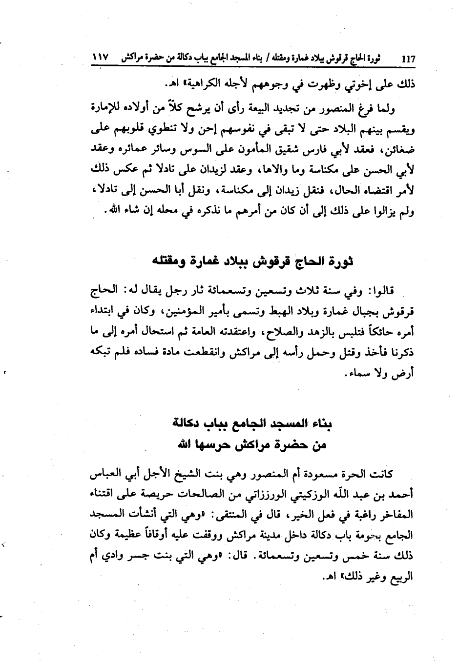 كَانَت الْحرَّة مسعودة أم الْمَنْصُور وَهِي بنت الشَّيْخ الْأَجَل أبي الْعَبَّاس أَحْمد بن عبد الله الوزكيتي الورززاتي من الصَّالِحَات حريصة على اقتناء المفاخر راغبة فِي فعل الْخَيْر قَالَ فِي الْمُنْتَقى وَهِي الَّتِي أنشأت الْمَسْجِد الْجَامِع بحومة بَاب دكالة دَاخل مَدِينَة مراكش ووقفت عَلَيْهِ أوقافا عَظِيمَة وَكَانَ ذَلِك سنة خمس وَتِسْعين وَتِسْعمِائَة قَالَ وَهِي الَّتِي بنت جسر وَادي أم الرّبيع وَغير ذَلِك اه