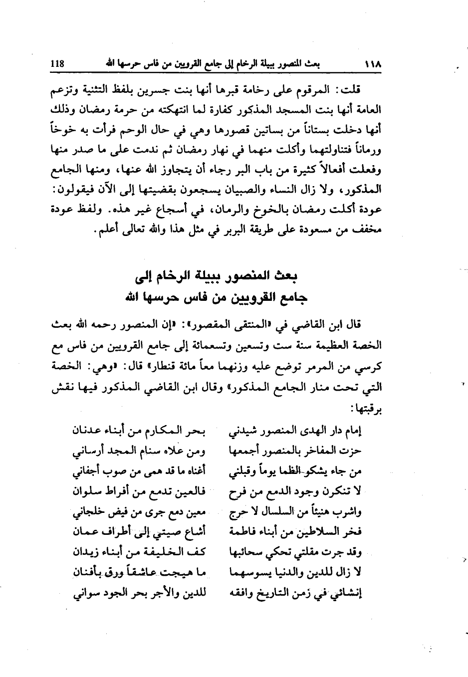 قَالَ ابْن القَاضِي فِي الْمُنْتَقى الْمَقْصُور إِن الْمَنْصُور رَحمَه الله بعث الخصة الْعَظِيمَة سنة سِتّ وَتِسْعين وَتِسْعمِائَة إِلَى جَامع الْقرَوِيين من فاس مَعَ كرْسِي من المرمر تُوضَع عَلَيْهِ وزنهما مَعًا مائَة قِنْطَار قَالَ وَهِي الخصة الَّتِي تَحت منار الْجَامِع الْمَذْكُور وَقَالَ ابْن القَاضِي الْمَذْكُور فِيهَا نقش برقبتها