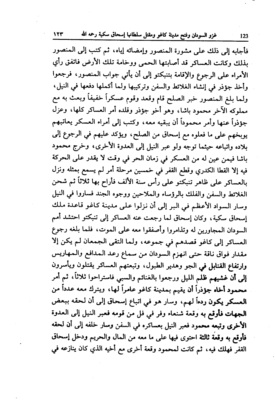 فَأَجَابَهُ إِلَى ذَلِك على مشورة الْمَنْصُور وإمضائه إِيَّاه ثمَّ كتب إِلَى الْمَنْصُور بذلك وَكَانَت العساكر قد أصابتها الْحمى ووخامة تِلْكَ الأَرْض فاتفق رَأْي الْأُمَرَاء على الرُّجُوع وَالْإِقَامَة بتنبكتو إِلَى أَن يَأْتِي جَوَاب الْمَنْصُور فَرَجَعُوا وَأخذ جؤذر فِي إنْشَاء الغلائط والسفن وتركيبها وَلما أكملها دَفعهَا فِي النّيل وَلما بلغ الْمَنْصُور خبر الصُّلْح قَامَ وَقعد وَقوم عسكرا خَفِيفا وَبعث بِهِ مَعَ مَمْلُوكه الآخر مَحْمُود باشا وَهُوَ أَخُو جؤذر وقلده أَمر العساكر كلهَا وعزل جؤذرا عَنْهَا وَأمر مَحْمُودًا أَن يبقيه مَعَه وَكتب إِلَى أُمَرَاء الْعَسْكَر يعاتبهم يوبخهم على مَا فَعَلُوهُ مَعَ إِسْحَاق من الصُّلْح ويؤكد عَلَيْهِم فِي الرُّجُوع إِلَى بِلَاده واتباعه حَيْثُمَا توجه وَلَو عبر النّيل إِلَى العدوة الْأُخْرَى وَخرج مَحْمُود باشا فِيمَن عين لَهُ من الْعَسْكَر فِي زمَان الْحر فِي وَقت لَا يقدر على الْحَرَكَة فِيهِ إِلَّا القطا الكدري وَقطع القفر فِي خمسين مرحلة أَمر لم يسمع بِمثلِهِ وَنزل بالعساكر على ظَاهر تنبكتو على رَأس سنة الْألف فأراح بهَا ثَلَاثًا ثمَّ شحن الغلائط والسفن والفلك بالرؤساء والملاحين ووجوه الْجند فَسَارُوا فِي النّيل وَسَار السوَاد الْأَعْظَم فِي الْبر إِلَى أَن نزلُوا على مَدِينَة كاغو قَاعِدَة ملك إِسْحَاق سكية وَكَانَ إِسْحَاق لما رجعت عَنهُ العساكر إِلَى تنبكتو احتشد أُمَم السودَان المجاورين لَهُ وتذامروا وأصفقوا مَعَه على الْمَوْت فَلَمَّا بلغه رُجُوع العساكر إِلَى كاغو قصدهم فِي جموعه وَلما التقى الْجَمْعَانِ لم يكن إِلَّا مِقْدَار فوَاق نَاقَة حَتَّى انهزم السودَان من سَماع رعد المدافع والمهاريس وارتفاع القنابل فِي الجو وهدير الطبول وتبعتهم العساكر يقتلُون وَيَأْسِرُونَ إِلَى أَن غشيهم ظلم اللَّيْل وَرَجَعُوا بالغنائم والسبي فاستراحوا ثَلَاثًا ثمَّ أَمر مَحْمُود أَخَاهُ جؤذرا أَن يُقيم بِمَدِينَة كاغو عَامِرًا لَهَا وَيتْرك مَعَه عددا من الْعَسْكَر يكون ردْءًا لَهُم وَسَار هُوَ فِي اتِّبَاع إِسْحَاق إِلَى أَن لحقه بِبَعْض الْجِهَات فأوقع بِهِ وقْعَة شنعاء وفر فِي فل من قومه فَعبر النّيل إِلَى العدوة الْأُخْرَى وَتَبعهُ مَحْمُود فَعبر النّيل بعساكره فِي السفن وَسَار خَلفه إِلَى أَن لحقه فأوقع بِهِ وقْعَة ثَالِثَة احتوى فِيهَا على مَا مَعَه من المَال والحريم وَدخل إِسْحَاق القفر فَهَلَك فِيهِ ثمَّ كَانَت لمحمود وقْعَة أُخْرَى مَعَ أَخِيه الَّذِي كَانَ ينازعه فِي