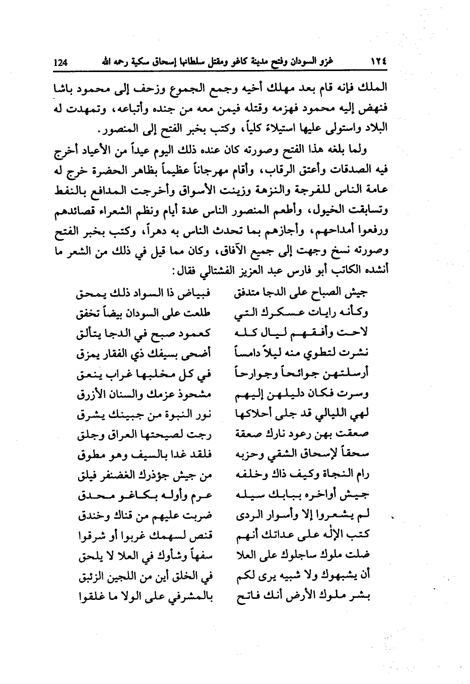 وَلما بلغه هَذَا الْفَتْح وَصورته كَانَ عِنْده ذَلِك الْيَوْم عيدا من الأعياد أخرج فِيهِ الصَّدقَات وَأعْتق الرّقاب وَأقَام مهرجانا عَظِيما بِظَاهِر الحضرة خرج لَهُ عَامَّة النَّاس للفرجة والنزهة وزينت الْأَسْوَاق وأخرجت المدافع بالنفط وتسابقت الْخُيُول وَأطْعم الْمَنْصُور النَّاس عدَّة أَيَّام ونظم الشُّعَرَاء قصائدهم وَرفعُوا أمداحهم وَأَجَازَهُمْ بِمَا تحدث النَّاس بِهِ دهرا وَكتب بِخَبَر الْفَتْح وَصورته نسخ وجهت إِلَى جَمِيع الْآفَاق وَكَانَ مِمَّا قيل فِي ذَلِك من الشّعْر مَا أنْشدهُ الْكَاتِب أَبُو فَارس عبد الْعَزِيز الفشتالي فَقَالَ
