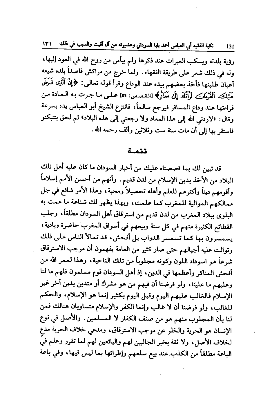 قد تبين لَك بِمَا قصصناه عَلَيْك من أَخْبَار السودَان مَا كَانَ عَلَيْهِ أهل تِلْكَ الْبِلَاد من الْأَخْذ بدين الْإِسْلَام من لدن قديم وَأَنَّهُمْ من أحسن الْأُمَم إسلاما وأقومهم دينا وَأَكْثَرهم للْعلم وَأَهله تحصيلا ومحبة وَهَذَا الْأَمر شَائِع فِي جلّ ممالكهم الموالية للمغرب كَمَا علمت وَبِهَذَا يظْهر لَك شناعة مَا عَمت بِهِ الْبلوى بِبِلَاد الْمغرب من لدن قديم من استرقاق أهل السودَان مُطلقًا وجلب القطائع الْكَثِيرَة مِنْهُم فِي كل سنة وبيعهم فِي أسواق الْمغرب حَاضِرَة وبادية يسمسرون بهَا كَمَا تسمسر الدَّوَابّ بل أفحش قد تمالأ النَّاس على ذَلِك وتوالت عَلَيْهِ أجيالهم حَتَّى صَار كثير من الْعَامَّة يفهمون أَن مُوجب الاسترقاق شرعا هُوَ اسوداد اللَّوْن وَكَونه مجلوبا من تِلْكَ النَّاحِيَة وَهَذَا لعمر الله من أفحش المناكر وَأَعْظَمهَا فِي الدّين إِذْ أهل السودَان قوم مُسلمُونَ فَلهم مَا لنا وَعَلَيْهِم مَا علينا وَلَو فَرضنَا أَن فيهم من هُوَ مُشْرك أَو متدين بدين آخر غير الْإِسْلَام فالغالب عَلَيْهِم الْيَوْم وَقبل الْيَوْم بِكَثِير إِنَّمَا هُوَ الْإِسْلَام وَالْحكم للْغَالِب وَلَو فَرضنَا أَن لَا غَالب وَإِنَّمَا الْكفْر وَالْإِسْلَام هُنَالك متساويان فَمن لنا بِأَن المجلوب مِنْهُم هُوَ من صنف الْكفَّار لَا الْمُسلمين وَالْأَصْل فِي نوع الْإِنْسَان هُوَ الْحُرِّيَّة والخلو عَن مُوجب الاسترقاق ومدعي خلاف الْحُرِّيَّة مُدع لخلاف الأَصْل وَلَا ثِقَة بِخَبَر الجالبين لَهُم والبائعين لَهُم لما تقرر وَعلم فِي الباعة مُطلقًا من الْكَذِب عِنْد بيع سلعهم وإطرائها بِمَا لَيْسَ فِيهَا وَفِي باعة