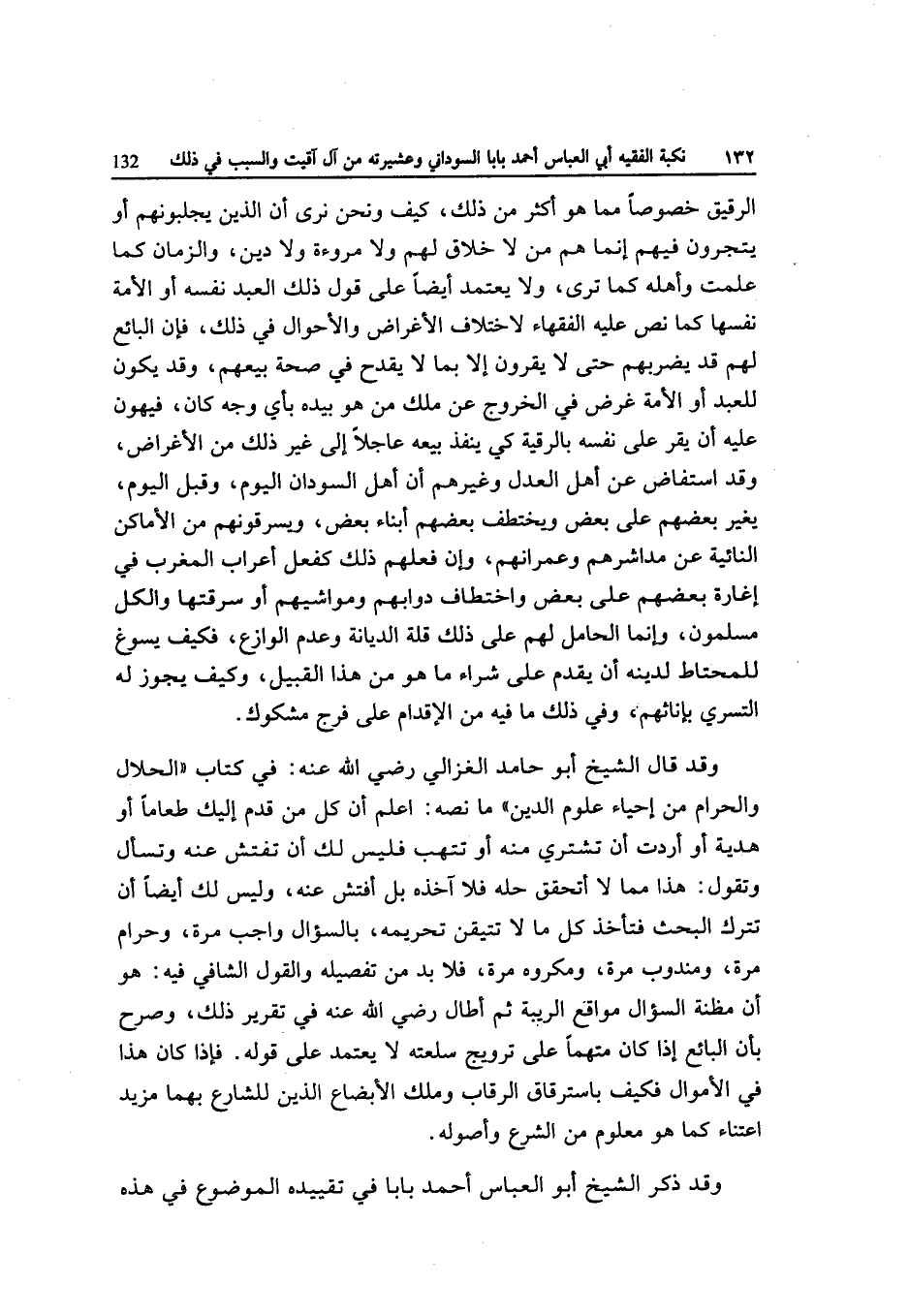 الرَّقِيق خُصُوصا مِمَّا هُوَ أَكثر من ذَلِك كَيفَ وَنحن نرى أَن الَّذين يجلبونهم أَو يتجرون فيهم إِنَّمَا هم من لَا خلاق لَهُم وَلَا مُرُوءَة وَلَا دين وَالزَّمَان كَمَا علمت وَأَهله كَمَا ترى وَلَا يعْتَمد أَيْضا على قَول ذَلِك العَبْد نَفسه أَو الْأمة نَفسهَا كَمَا نَص عَلَيْهِ الْفُقَهَاء لاخْتِلَاف الْأَغْرَاض وَالْأَحْوَال فِي ذَلِك فَإِن البَائِع لَهُم قد يَضْرِبهُمْ حَتَّى لَا يقرونَ إِلَّا بِمَا لَا يقْدَح فِي صِحَة بيعهم وَقد يكون للْعَبد أَو الْأمة غَرَض فِي الْخُرُوج من ملك من هُوَ بِيَدِهِ بِأَيّ وَجه كَانَ فيهون عَلَيْهِ أَن يقر على نَفسه بالرقية كي ينفذ بَيْعه عَاجلا إِلَى غير ذَلِك من الْأَغْرَاض وَقد استفاض عَن أهل الْعدْل وَغَيرهم أَن أهل السودَان الْيَوْم وَقبل الْيَوْم يُغير بَعضهم على بعض ويختطف بَعضهم أَبنَاء بعض ويسرقونهم من الْأَمَاكِن النائية عَن مداشرهم وعمرانهم وَإِن فعلهم ذَلِك كَفعل أَعْرَاب الْمغرب فِي إغارة بَعضهم على بعض واختطاف دوابهم ومواشيهم أَو سرقتها وَالْكل مُسلمُونَ وَإِنَّمَا الْحَامِل لَهُم على ذَلِك قلَّة الدّيانَة وَعدم الْوَازِع فَكيف يسوغ للمحتاط لدينِهِ أَن يقدم على شِرَاء مَا هُوَ من هَذَا الْقَبِيل وَكَيف يجوز لَهُ التَّسَرِّي بإناثهم وَفِي ذَلِك مَا فِيهِ من الْإِقْدَام على فرج مَشْكُوك