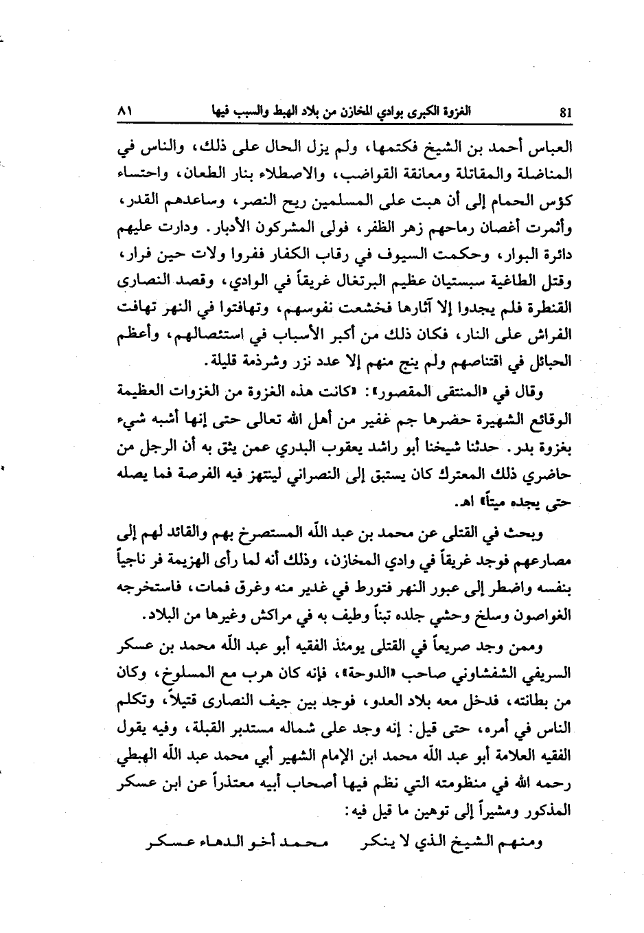 وَمِمَّنْ وجد صَرِيعًا فِي الْقَتْلَى يَوْمئِذٍ الْفَقِيه أَبُو عبد الله مُحَمَّد بن عَسْكَر السريفي الشفشاوني صَاحب الدوحة فَإِنَّهُ كَانَ هرب مَعَ المسلوخ وَكَانَ من بطانته فَدخل مَعَه بِلَاد الْعَدو فَوجدَ بَين جيف النَّصَارَى قَتِيلا وَتكلم النَّاس فِي أمره حَتَّى قيل إِنَّه وجد على شِمَاله مستدبر الْقبْلَة وَفِيه يَقُول الْفَقِيه الْعَلامَة أَبُو عبد الله مُحَمَّد ابْن الإِمَام الشهير أبي مُحَمَّد عبد الله الهبطي رَحمَه الله فِي منظومته الَّتِي نظم فِيهَا أَصْحَاب أَبِيه معتذرا عَن ابْن عَسْكَر الْمَذْكُور ومشيرا إِلَى توهين مَا قيل فِيهِ