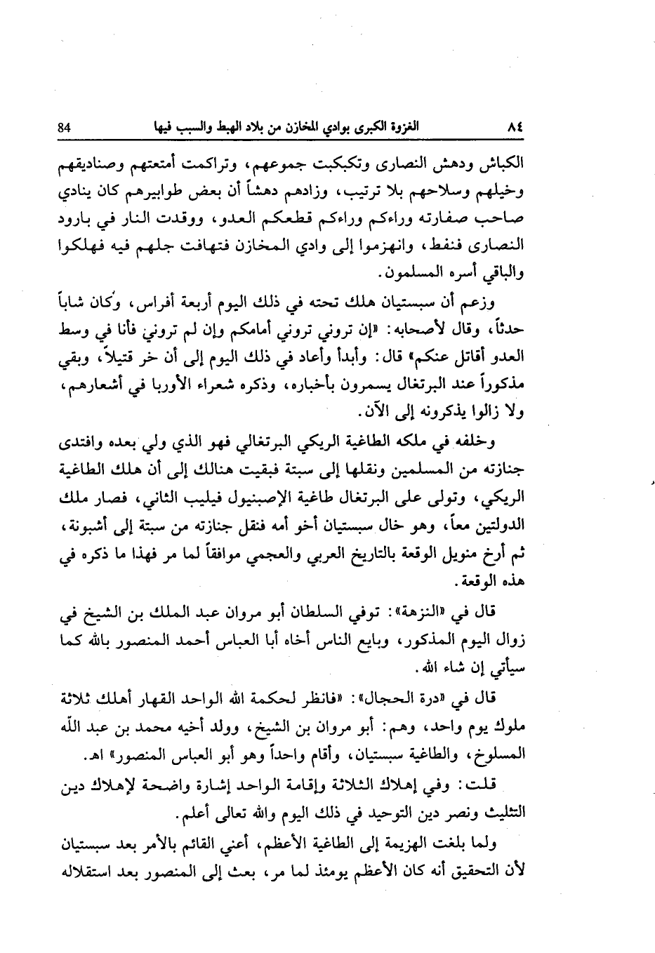 وَزعم أَن سبستيان هلك تَحْتَهُ فِي ذَلِك الْيَوْم أَرْبَعَة أَفْرَاس وَكَانَ شَابًّا حَدثا وَقَالَ لأَصْحَابه إِن تروني تروني أمامكم وَإِن لم تروني فَأَنا فِي وسط الْعَدو أقَاتل عَنْكُم قَالَ وأبدأ وَأعَاد فِي ذَلِك الْيَوْم إِلَى أَن خر قَتِيلا وَبَقِي مَذْكُورا عِنْد البرتغال يسمرون بأخباره وَذكره شعراء الأوربا فِي أشعارهم وَلَا زَالُوا يذكرُونَهُ إِلَى الْآن
