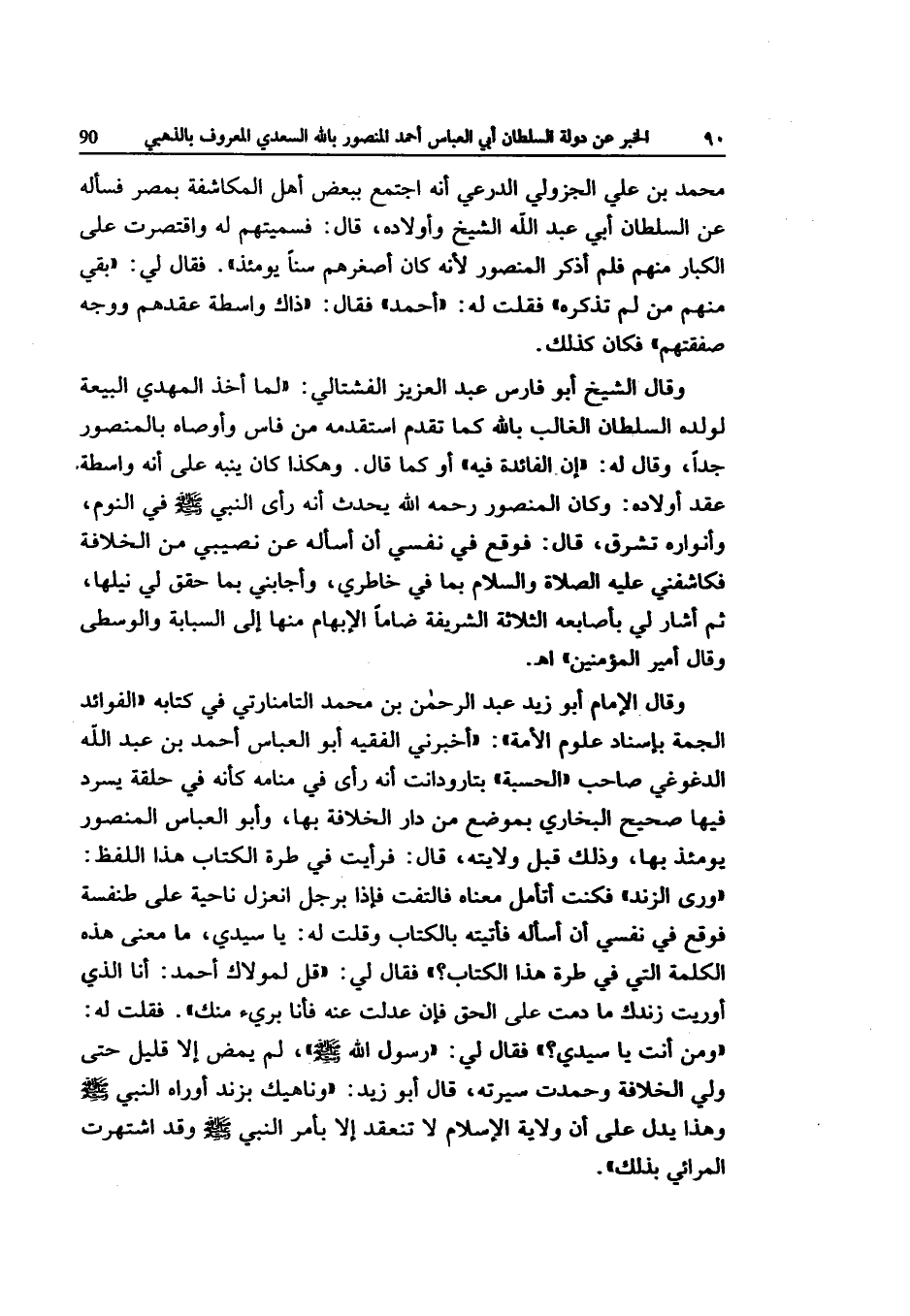 وَقَالَ الشَّيْخ أَبُو فَارس عبد الْعَزِيز الفشتالي لما أَخذ الْمهْدي الْبيعَة لوَلَده السُّلْطَان الْغَالِب بِاللَّه كَمَا تقدم استقدمه من فاس وأوصاه بالمنصور جدا وَقَالَ لَهُ إِن الْفَائِدَة فِيهِ أَو كَمَا قَالَ وَهَكَذَا كَانَ يُنَبه على أَنه وَاسِطَة عقد أَوْلَاده وَكَانَ الْمَنْصُور رَحمَه الله يحدث أَنه رأى النَّبِي صلى الله عَلَيْهِ وَسلم فِي النّوم وأنواره تشرق قَالَ فَوَقع فِي نَفسِي أَن أسأله عَن نَصِيبي من الْخلَافَة فكاشفني صلى الله عَلَيْهِ وَسلم بِمَا فِي خاطري وأجابني بِمَا حقق لي نيلها ثمَّ أَشَارَ لي بأصابعه الثَّلَاثَة الشَّرِيفَة ضاما الْإِبْهَام مِنْهَا إِلَى السبابَة وَالْوُسْطَى وَقَالَ أَمِير الْمُؤمنِينَ اه