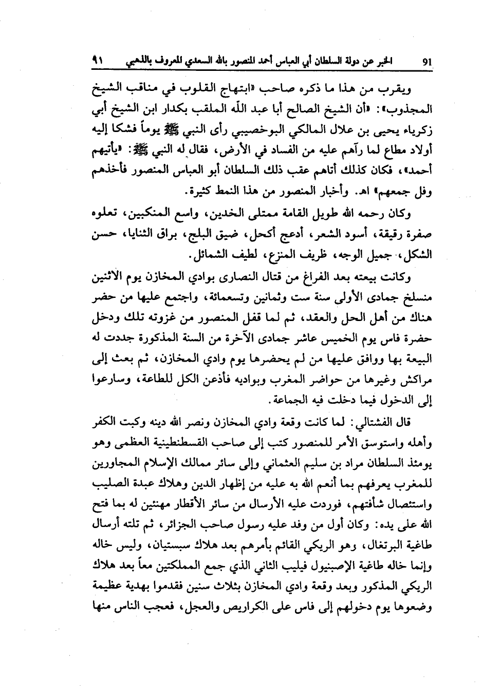 وَيقرب من هَذَا مَا ذكره صَاحب ابتهاج الْقُلُوب فِي مَنَاقِب الشَّيْخ المجذوب أَن الشَّيْخ الصَّالح أَبَا عبد الله الملقب بكدار ابْن الشَّيْخ أبي زَكَرِيَّاء يحيى بن علال الْمَالِكِي البوخصيبي رأى النَّبِي صلى الله عَلَيْهِ وَسلم يَوْم فَشَكا إِلَيْهِ أَوْلَاد مُطَاع لما رَآهُمْ عَلَيْهِ من الْفساد فِي الأَرْض فَقَالَ لَهُ النَّبِي صلى الله عَلَيْهِ وَسلم يَأْتِيهم أَحْمد فَكَانَ كَذَلِك أَتَاهُم عقب ذَلِك السُّلْطَان أَبُو الْعَبَّاس الْمَنْصُور فَأَخذهُم وفل جمعهم اه وأخبار الْمَنْصُور من هَذَا النمط كَثِيرَة
