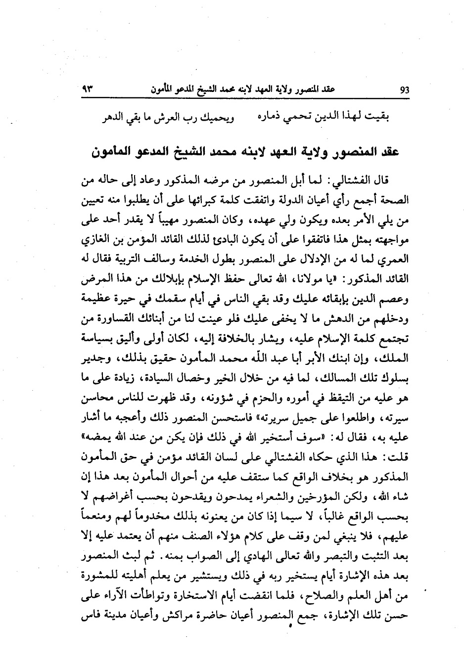 قَالَ الفشتالي لما أبل الْمَنْصُور من مَرضه الْمَذْكُور وَعَاد إِلَى حَاله من الصِّحَّة أجمع رَأْي أَعْيَان الدولة واتفقت كلمة كبرائها على أَن يطلبوا مِنْهُ تعْيين من يَلِي الْأَمر بعده وَيكون ولي عَهده وَكَانَ الْمَنْصُور مهيبا لَا يقدر أحد على مواجهته بِمثل هَذَا فاتفقوا على أَن يكون البادئ لذَلِك الْقَائِد الْمُؤمن بن الْغَازِي الْعمريّ لما لَهُ من الإدلال على الْمَنْصُور بطول الْخدمَة وسالف التربية فَقَالَ لَهُ الْقَائِد الْمَذْكُور يَا مَوْلَانَا الله تَعَالَى حفظ الْإِسْلَام بإبلالك من هَذَا الْمَرَض وعصم الدّين بإبقائه عَلَيْك وَقد بَقِي النَّاس فِي أَيَّام سقمك فِي حيرة عَظِيمَة ودخلهم من الدهش مَا لَا يخفى عَلَيْك فَلَو عينت لنا من أبنائك القساورة من تَجْتَمِع كلمة الْإِسْلَام عَلَيْهِ ويشار بالخلافة إِ ليه لَكَانَ أولى وأليق بسياسة الْملك وَإِن ابْنك الأبر أَبَا عبد الله مُحَمَّد الْمَأْمُون حقيق بذلك وجدير بسلوك تِلْكَ المسالك لما فِيهِ من خلال الْخَيْر وخصال السِّيَادَة زِيَادَة على مَا هُوَ عَلَيْهِ من التيقظ فِي أُمُوره والحزم فِي شؤونه وَقد ظَهرت للنَّاس محَاسِن سيرته واطلعوا على جميل سَرِيرَته فَاسْتحْسن الْمَنْصُور ذَلِك وَأَعْجَبهُ مَا أَشَارَ عَلَيْهِ بِهِ فَقَالَ لَهُ سَوف أستخير الله فِي ذَلِك فَإِن يكن من عِنْد الله يمضه قلت هَذَا الَّذِي حَكَاهُ الفشتالي على لِسَان الْقَائِد مُؤمن فِي حق الْمَأْمُون الْمَذْكُور هُوَ بِخِلَاف الْوَاقِع كَمَا ستقف عَلَيْهِ من أَحْوَال الْمَأْمُون بعد هَذَا إِن شَاءَ الله وَلَكِن المؤرخين وَالشعرَاء يمدحون ويقدحون بِحَسب أغراضهم لَا بِحَسب الْوَاقِع غَالِبا لَا سِيمَا إِذا كَانَ من يعنونه بذلك مخدوما لَهُم ومنعما عَلَيْهِم فَلَا يَنْبَغِي لمن وقف على كَلَام هَؤُلَاءِ الصِّنْف مِنْهُم أَن يعْتَمد عَلَيْهِ إِلَّا بعد التثبت والتبصر وَالله تَعَالَى الْهَادِي إِلَى الصَّوَاب بمنه ثمَّ لبث الْمَنْصُور بعد هَذِه الْإِشَارَة أَيَّام يستخير ربه فِي ذَلِك ويستشير من يعلم أَهْلِيَّته للمشورة من أهل الْعلم وَالصَّلَاح فَلَمَّا انْقَضتْ أَيَّام الاستخارة وتواطأت الآراء على حسن تِلْكَ الْإِشَارَة جمع الْمَنْصُور أَعْيَان حَاضِرَة مراكش وأعيان مَدِينَة فاس