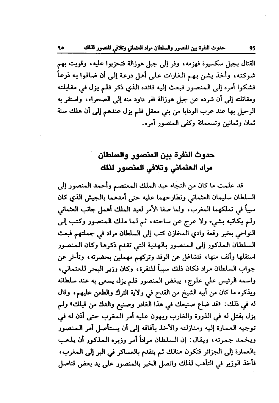 قد علمت مَا كَانَ من التجاء عبد الْملك المعتصم وَأحمد الْمَنْصُور إِلَى السُّلْطَان سُلَيْمَان العثماني وتطارحهما عَلَيْهِ حَتَّى أمدهما بالجيش الَّذِي كَانَ سَببا فِي تملكهما الْمغرب وَلما صفا الْأَمر لعبد الْملك أهمل جَانب العثماني وَلم يكاتبه بِشَيْء وَلَا عرج عَن ساحته ثمَّ لما ملك الْمَنْصُور وَكتب إِلَى النواحي بِخَبَر وقْعَة وَادي المخازن كتب إِلَى السُّلْطَان مُرَاد فِي جُمْلَتهمْ فَبعث السُّلْطَان الْمَذْكُور إِلَى الْمَنْصُور بالهدية الَّتِي تقدم ذكرهَا وَكَانَ الْمَنْصُور استقلها وأنف مِنْهَا فتشاغل عَن الْوَفْد وتركهم مهملين بِحَضْرَتِهِ وَتَأَخر عَن جَوَاب السُّلْطَان مُرَاد فَكَانَ ذَلِك سَببا للنفرة وَكَانَ وَزِير الْبَحْر للعثماني واسْمه الرئيس عَليّ علوج يبغض الْمَنْصُور فَلم يزل يسْعَى بِهِ عِنْد سُلْطَانه ويذكره مَا كَانَ من أَبِيه الشَّيْخ من الْقدح فِي ولَايَة التّرْك والطعن عَلَيْهِم وَقَالَ لَهُ فِي ذَلِك قد ضَاعَ صنيعك فِي هَذَا الغادر وصنيع والدك من قبلك وَلم يزل يفتل لَهُ فِي الذرْوَة وَالْغَارِب ويهون عَلَيْهِ أَمر الْمغرب حَتَّى أذن لَهُ فِي تَوْجِيه الْعِمَارَة إِلَيْهِ ومنازلته وَالْأَخْذ بآفاقه إِلَى أَن يستأصل أَمر الْمَنْصُور ويخمد جمرته وَيُقَال إِن السُّلْطَان مرَادا أَمر وزيره الْمَذْكُور أَن يذهب بالعمارة إِلَى الجزائر فَتكون هُنَالك ثمَّ يتَقَدَّم بالعساكر فِي الْبر إِلَى الْمغرب فَأخذ الْوَزير فِي التأهب لذَلِك واتصل الْخَبَر بالمنصور على يَد بعض قناصل