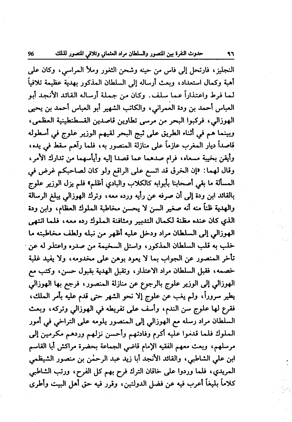 النجليز فارتحل إِلَى فاس من حِينه وشحن الثغور وملأ المراسي وَكَانَ على أهبة وَكَمَال استعداد وَبعث أرساله إِلَى السُّلْطَان الْمَذْكُور بهدية عَظِيمَة تلافيا لما فرط واعتذارا عَمَّا سلف وَكَانَ من جملَة أرساله الْقَائِد الأنجد أَبُو الْعَبَّاس أَحْمد بن ودة العمراني وَالْكَاتِب الشهير أَبُو الْعَبَّاس أَحْمد بن يحيى الهوزالي فَرَكبُوا الْبَحْر من مرسى تطاوين قَاصِدين الْقُسْطَنْطِينِيَّة الْعُظْمَى وبينما هم فِي أثْنَاء الطَّرِيق على ثبج الْبَحْر لَقِيَهُمْ الْوَزير علوج فِي أسطوله قَاصِدا ديار الْمغرب عَازِمًا على منازلة الْمَنْصُور بِهِ فَلَمَّا رَآهُمْ سقط فِي يَده وأيقن بخيبة مسعاه فرام صدهما عَمَّا قصدا إِلَيْهِ وأيأسهما من تدارك الْأَمر وَقَالَ لَهما إِن الْخرق قد اتَّسع على الراقع وَلَو كَانَ لصاحبكم غَرَض فِي الْمَسْأَلَة مَا بَقِي أَصْحَابنَا بأبوابه كالكلاب والبادي أظلم فَلم يزل الْوَزير علوج بالقائد ابْن ودة إِلَى أَن صرفه عَن رَأْيه ورده مَعَه وَترك الهوزالي يبلغ الرسَالَة والهدية ظنا مِنْهُ أَن صَغِير السن لَا يحسن مُخَاطبَة الْمُلُوك الْعِظَام وَابْن ودة الَّذِي كَانَ عِنْده مَظَنَّة لكَمَال التَّدْبِير ومثافنة الْمُلُوك رده مَعَه فَلَمَّا انْتهى الهوزالي إِلَى السُّلْطَان مُرَاد وَدخل عَلَيْهِ أظهر من نبله ولطف مخاطبته مَا خلب بِهِ قلب السُّلْطَان الْمَذْكُور واستل السخيمة من صَدره وَاعْتذر لَهُ عَن تَأَخّر الْمَنْصُور عَن الْجَواب بِمَا لَا يعود بوهن على مخدومه وَلَا يُفِيد غَلَبَة خَصمه فَقبل السُّلْطَان مُرَاد الِاعْتِذَار وَتقبل الْهَدِيَّة بِقبُول حسن وَكتب مَعَ الهوزالي إِلَى الْوَزير علوج بِالرُّجُوعِ عَن منازلة الْمَنْصُور فَرجع بهَا الهوزالي يطير سُرُورًا وَلم يغب عَن علوج إِلَّا نَحْو الشَّهْر حَتَّى قدم عَلَيْهِ بِأَمْر الْملك فقرع لَهَا علوج سنّ النَّدَم وأسف على تفريطه فِي الهوزالي وَتَركه وَبعث السُّلْطَان مُرَاد رسله مَعَ الهوزالي إِلَى الْمَنْصُور يلومه على التَّرَاخِي فِي أُمُور الْمُلُوك فَلَمَّا قدمُوا عَلَيْهِ أكْرم وفادتهم وَأحسن نزلهم وردهم مكرمين إِلَى مرسلهم وَبعث مَعَهم الْفَقِيه الإِمَام قَاضِي الْجَمَاعَة بِحَضْرَة مراكش أَبَا الْقَاسِم ابْن عَليّ الشاطبي والقائد الأنجد أَبَا زيد عبد الرَّحْمَن بن مَنْصُور الشيظمي المريدي فَلَمَّا وردوا على خاقَان التّرْك فَرح بهم كل الْفَرح ورتب الشاطبي كلَاما بليغا أعرب فِيهِ عَن فضل الدولتين وَقرر فِيهِ حق أهل الْبَيْت وأطرى