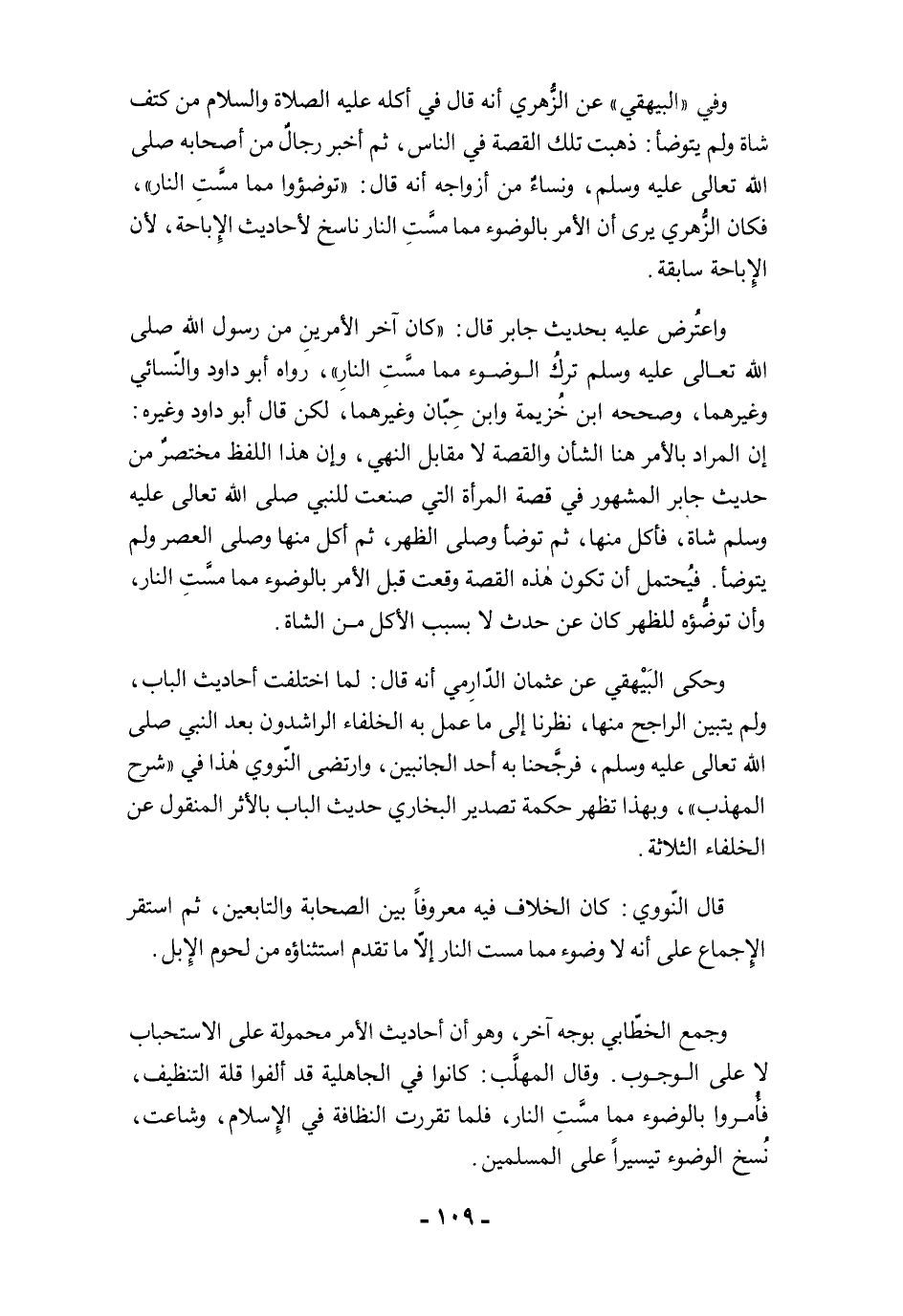 وفي "البيهقي" عن الزُّهري أنه قال في أكله عليه الصلاة والسلام من كتف شاة ولم يتوضأ: ذهبت تلك القصة في الناس، ثم أخبر رجالٌ من أصحابه صلى الله تعالى عليه وسلم، ونساءٌ من أزواجه أنه قال: "توضؤوا مما مسَّتِ النار"، فكان الزُّهري يرى أن الأمر بالوضوء مما مسَّتِ النار ناسخ لأحاديث الإباحة؛ لأن الإِباحة سابقة.
