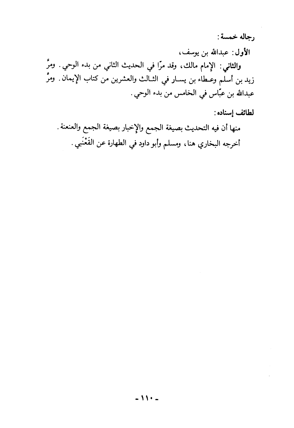 الأول: عبد الله بن يوسف، والثاني: الإمام مالك، وقد مرّا في الحديث الثاني من بدء الوحي. ومرَّ زيد بن أسلم وعطاء بن يسار في الثالث والعشرين من كتاب الإيمان. ومرَّ عبد الله بن عبّاس في الخامس من بدء الوحي.