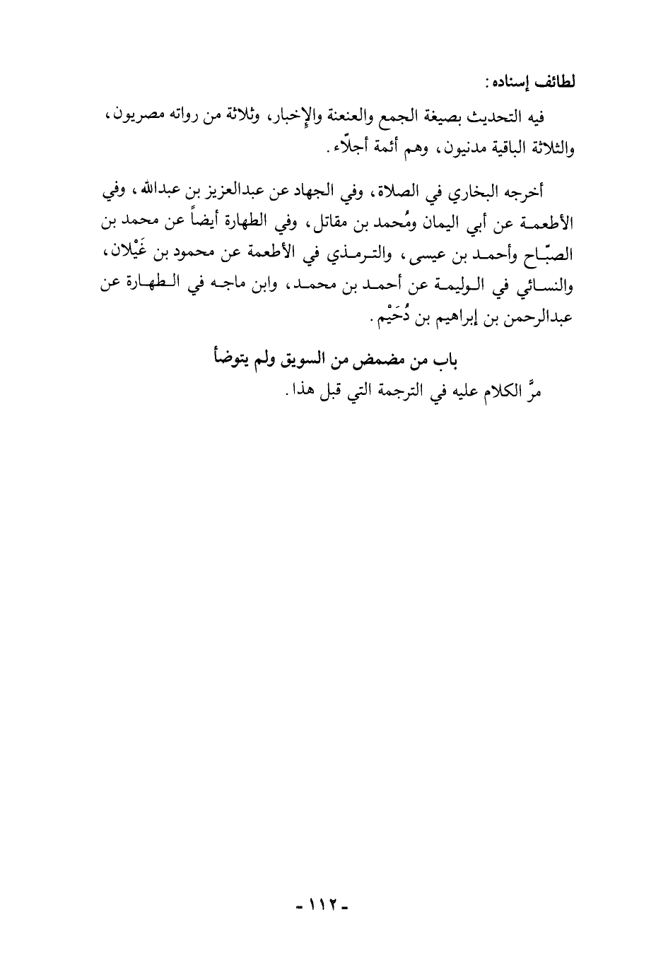 أخرجه البخاري في الصلاة، وفي الجهاد عن عبد العزيز بن عبد الله، وفي الأطعمة عن أبي اليمان ومُحمد بن مقاتل، وفي الطهارة أيضًا عن محمد بن الصبّاح وأحمد بن عيسى، والترمذي في الأطعمة عن محمود بن غَيْلان، والنسائي في الوليمة عن أحمد بن محمد، وابن ماجه في الطهارة عن عبد الرحمن بن إبراهيم بن دُحَيْم.