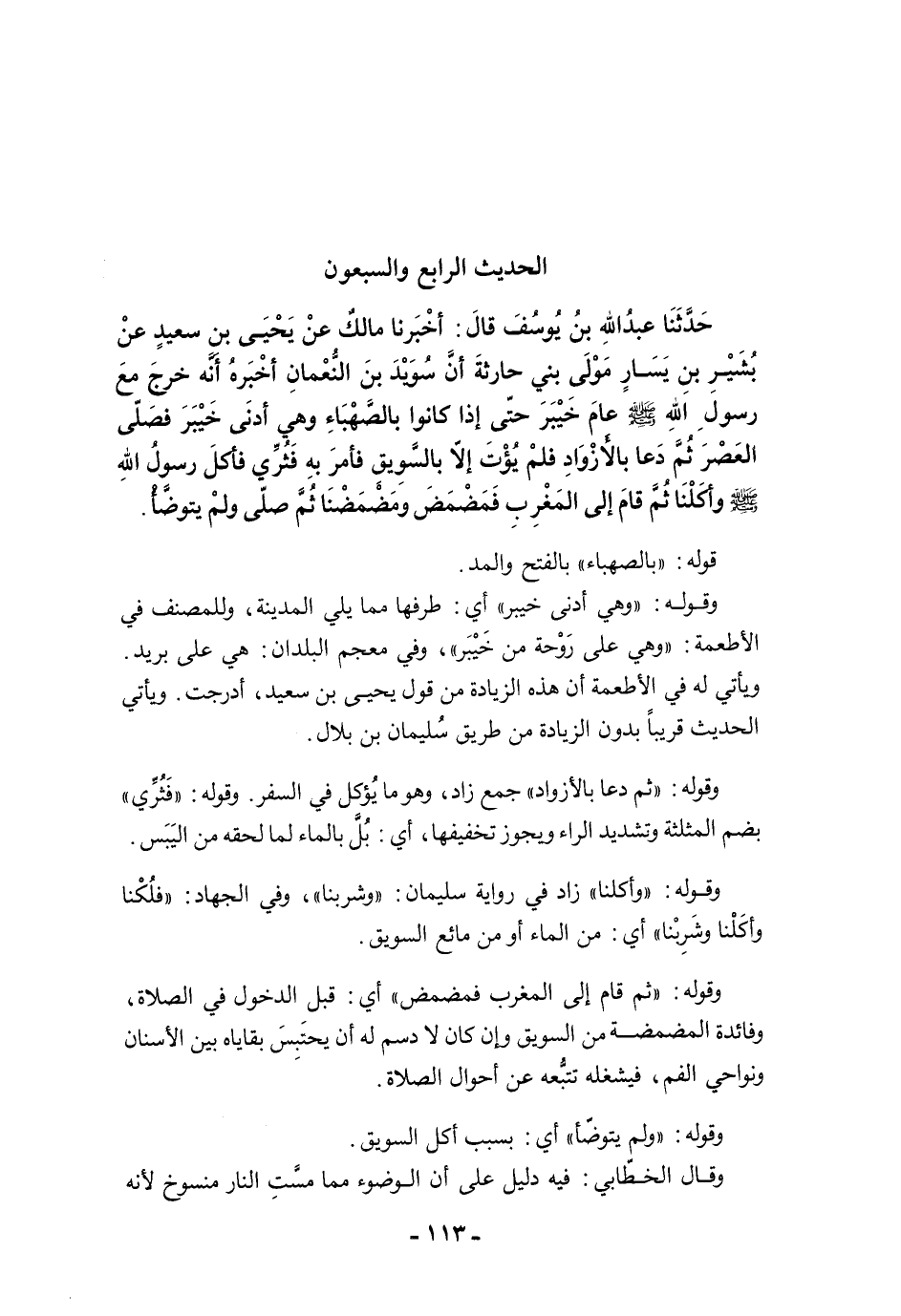 حَدَّثَنَا عَبْدُ اللَّهِ بْنُ يُوسُفَ قَالَ: أَخْبَرَنَا مَالِكٌ عَنْ يَحْيَى بْنِ سَعِيدٍ عَنْ بُشَيْرِ بْنِ يَسَارٍ مَوْلَى بَنِي حَارِثَةَ أَنَّ سُوَيْدَ بْنَ النُّعْمَانِ أَخْبَرَهُ. أَنَّهُ خَرَجَ مَعَ رَسُولِ اللَّهِ -صلى الله عليه وسلم- عَامَ خَيْبَرَ، حَتَّى إِذَا كَانُوا بِالصَّهْبَاءِ وَهِيَ أَدْنَى خَيْبَرَ فَصَلَّى الْعَصْرَ، ثُمَّ دَعَا بِالأَزْوَادِ، فَلَمْ يُؤْتَ إِلاَّ بِالسَّوِيقِ، فَأَمَرَ بِهِ فَثُرِّيَ، فَأَكَلَ رَسُولُ اللَّهِ -صلى الله عليه وسلم- وَأَكَلْنَا، ثُمَّ قَامَ إِلَى الْمَغْرِبِ، فَمَضْمَضَ وَمَضْمَضْنَا، ثُمَّ صَلَّى وَلَمْ يَتَوَضَّأْ.
