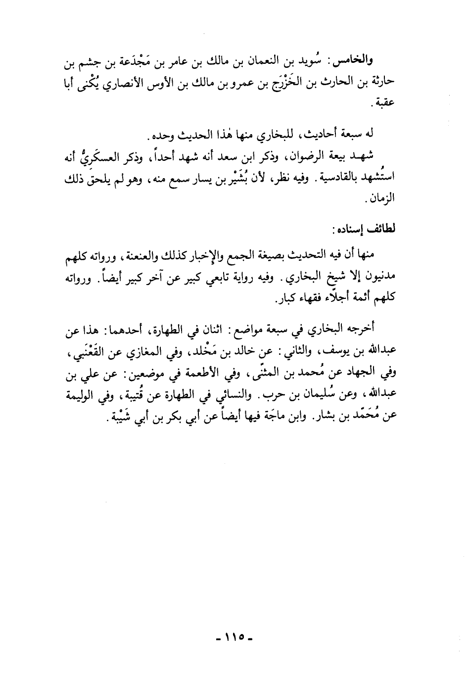 والخامس: سُويد بن النعمان بن مالك بن عامر بن مَجْدَعة بن جشم بن حارثة بن الحارث بن الخَزْرجَ بن عمرو بن مالك بن الأوس الأنصاري يُكْنى أبا عقبة.