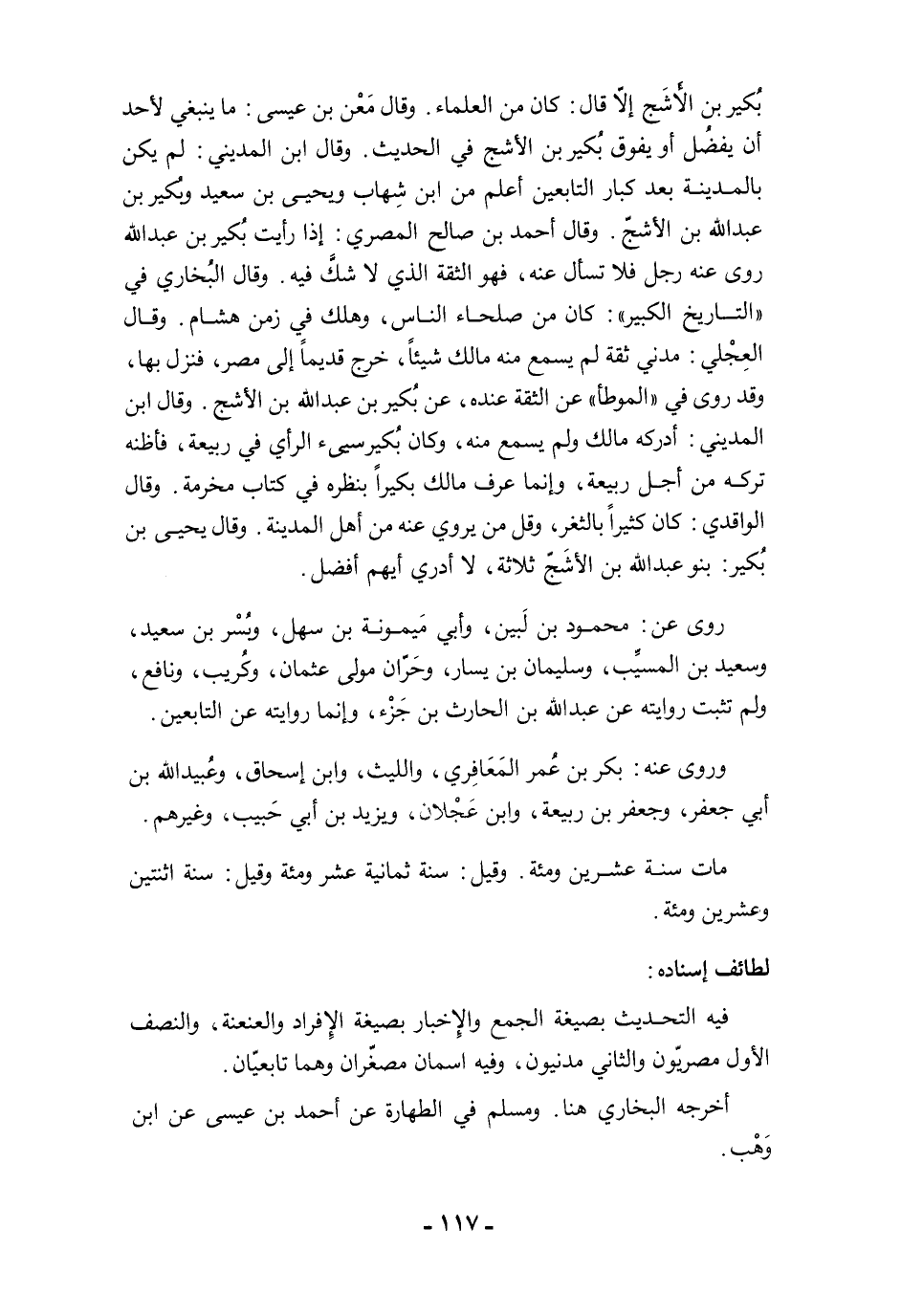 بُكير بن الأَشَج إلاَّ قال: كان من العلماء. وقال مَعْن بن عيسى: ما ينبغي لأحد أن يفضُل أو يفوق بُكير بن الأشج في الحديث. وقال ابن المديني: لم يكن بالمدينة بعد كبار التابعين أعلم من ابن شِهاب ويحيى بن سعيد وبُكير بن عبد الله بن الأشجّ. وقال أحمد بن صالح المصري: إذا رأيت بُكير بن عبد الله روى عنه رجل فلا تسأل عنه، فهو الثقة الذي لا شكَّ فيه. وقال البُخاري في "التاريخ الكبير": كان من صلحاء الناس، وهلك في زمن هشام. وقال العِجْلي: مدني ثقة لم يسمع منه مالك شيئًا، خرج قديمًا إلى مصر، فنزل بها، وقد روى في "الموطأ" عن الثقة عنده، عن بُكير بن عبد الله بن الأشج. وقال ابن المديني: أدركه مالك ولم يسمع منه، وكان بُكير سيىء الرأي في ربيعة، فأظنه تركه من أجل ربيعة، وإنما عرف مالك بكيرًا بنظره في كتاب مخرمة. وقال الواقدي: كان كثيرًا بالثغر، وقيل من يروي عنه من أهل المدينة. وقال يحيى بن بُكير: بنو عبد الله بن الأشَجّ ثلاثة، لا أدري أيهم أفضل.