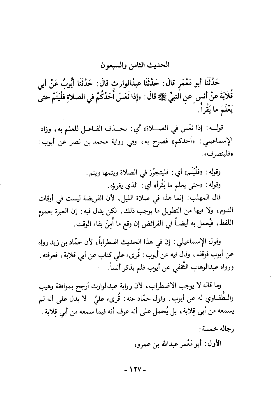 حَدَّثَنَا أَبُو مَعْمَرٍ قَالَ: حَدَّثَنَا عَبْدُ الْوَارِثِ قَالَ: حَدَّثَنَا أَيُّوبُ عَنْ أَبِي قِلاَبَةَ عَنْ أَنَسٍ عَنِ النَّبِيِّ -صلى الله عليه وسلم- قَالَ: "إِذَا نَعَسَ أَحَدُكُمْ فِي الصَّلاَةِ فَلْيَنَمْ حَتَّى يَعْلَمَ مَا يَقْرَأُ".