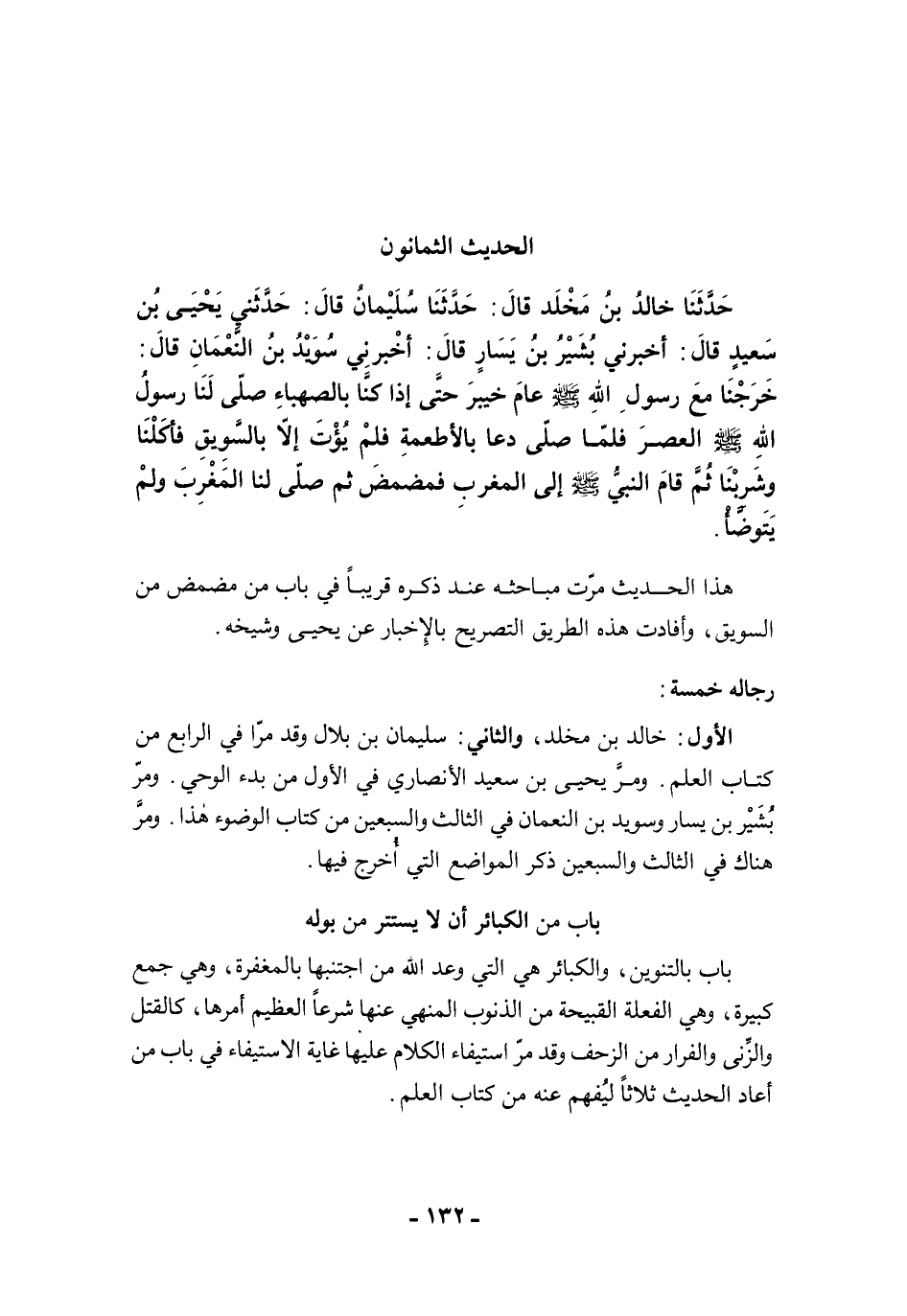 الأول: خالد بن مخلد، والثاني: سليمان بن بلال وقد مرّا في الرابع من كتاب العلم. ومرَّ يحيى بن سعيد الأنصاري في الأول من بدء الوحي. ومرّ بُشَيْر بن يسار وسويد بن النعمان في الثالث والسبعين من كتاب الوضوء هذا. ومرَّ هناك في الثالث والسبعين ذكر المواضع التي أُخرج فيها.