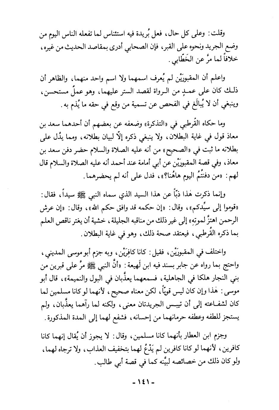 وما حكاه القُرطبي في "التذكرة" وضعفه عن بعضهم أن أحدهما سعد بن معاذ قول في غاية البطلان، ولا ينبغي ذكره إلاَّ لبيان بطلانه، ومما يدُل على بطلانه ما ثبت في "الصحيح" من أنه عليه الصلاة والسلام حضر دفن سعد بن معاذ، وفي قصة المقبورَيْن عن أبي أمامة عند أحمد أنه عليه الصلاة والسلام قال لهم: "من دفنتُمُ اليوم هاهُنا؟ "، فدل على أنه لم يحضرهما.