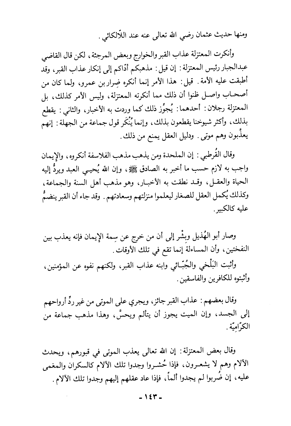 وأنكرت المعتزلة عذاب القبر والخوارج وبعض المرجئة، لكن قال القاضي عبد الجبار رئيس المعتزلة: إن قيل: مذهبكم أدّاكم إلى إنكار عذاب القبر، وقد أطبقت عليه الأمة. قيل: هذا الأمر إنما أنكره ضِرار بن عمرو، ولما كان من أصحاب واصل ظنوا أن ذلك مما أنكرته المعتزلة، وليس الأمر كذلك، بل المعتزلة رجلان: أحدهما: يُجوِّز ذلك كما وردت به الأخبار، والثاني: يقطع بذلك، وأكثر شيوخنا يقطعون بذلك، وإنما يُنْكَر قول جماعة من الجهلة: إنهم يعذَّبون وهم موتى. ودليل العقل يمنع من ذلك.