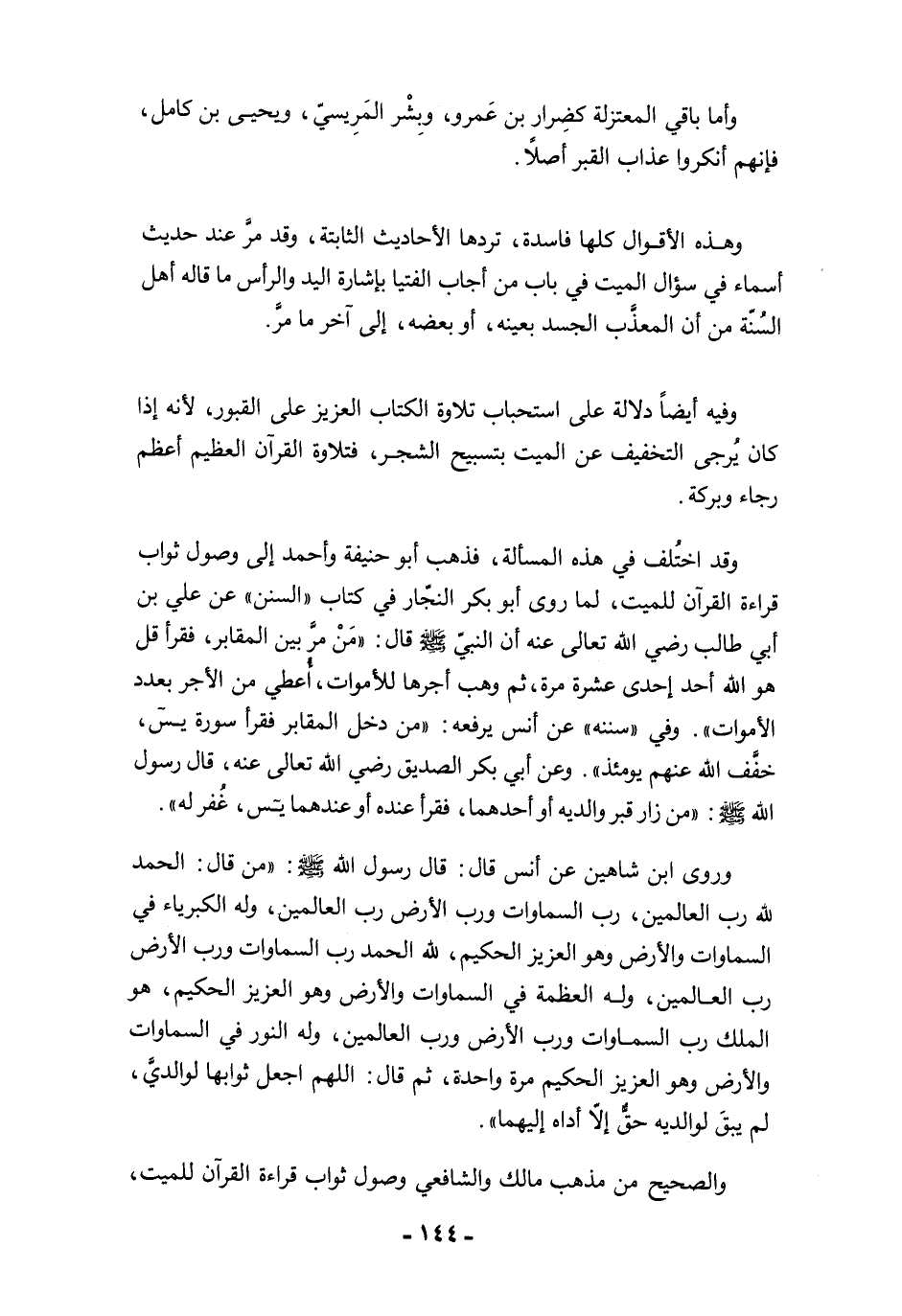 وقد اختُلف في هذه المسألة، فذهب أبو حنيفة وأحمد إلى وصول ثواب قراءة القرآن للميت، لما روى أبو بكر النجّار في كتاب "السنن" عن علي بن أبي طالب رضي الله تعالى عنه أن النبيّ -صلى الله عليه وسلم- قال: "مَنْ مرَّ بين المقابر، فقرأ قل هو الله أحد إحدى عشرة مرة، ثم وهب أجرها للأموات، أُعطي من الأجر بعدد الأموات". وفي "سننه" عن أنس يرفعه: "من دخل المقابر فقرأ سورة يس، خفَّف الله عنهم يومئذ". وعن أبي بكر الصديق رضي الله تعالى عنه، قال رسول الله -صلى الله عليه وسلم-: "من زار قبر والديه أو أحدهما، فقرأ عنده أو عندهما يس، غُفر له".
