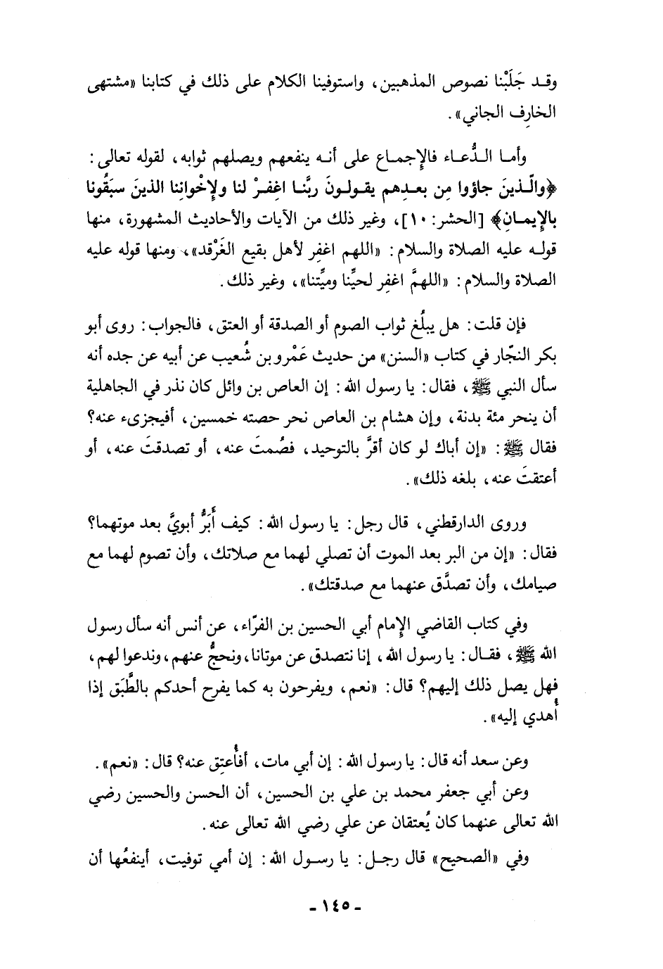 وأما الدُّعاء فالإجماع على أنه ينفعهم ويصلهم ثوابه، لقوله تعالى: {وَالَّذِينَ جَاءُوا مِنْ بَعْدِهِمْ يَقُولُونَ رَبَّنَا اغْفِرْ لَنَا وَلِإِخْوَانِنَا الَّذِينَ سَبَقُونَا بِالْإِيمَانِ} [الحشر: 10]، وغير ذلك من الآيات والأحاديث المشهورة، منها قوله عليه الصلاة والسلام: "اللهم اغفِر لأهل بقيع الغَرْقد"، ومنها قوله عليه الصلاة والسلام: "اللهمَّ اغفِر لحيِّنا وميِّتنا"، وغير ذلك.