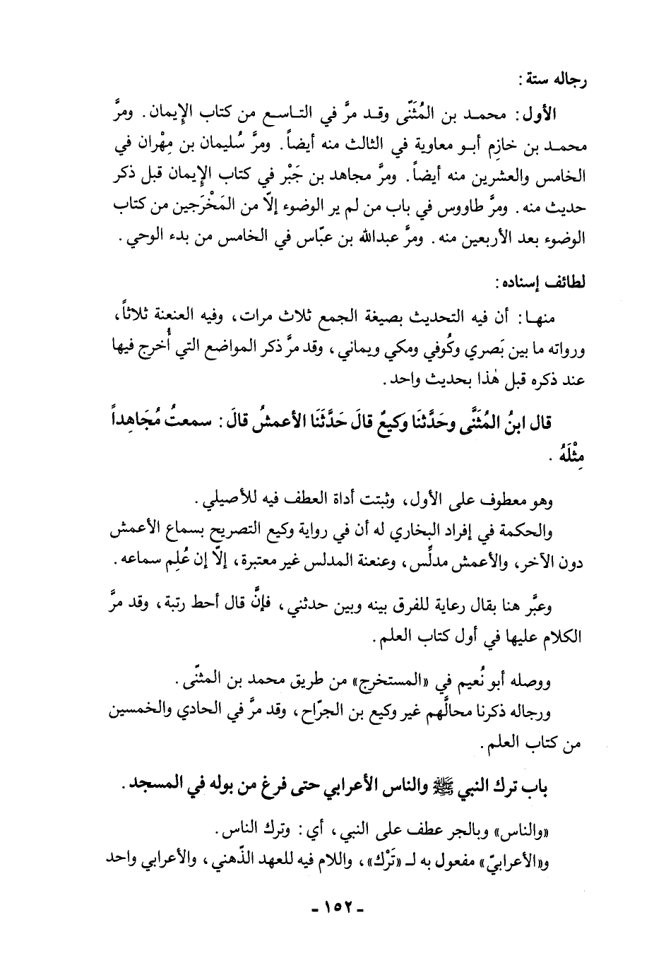 الأول: محمد بن المُثَنّى وقد مرَّ في التاسع من كتاب الإِيمان. ومرَّ محمد بن خازِم أبو معاوية في الثالث منه أيضًا. ومرّ سُليمان بن مِهْران في الخامس والعشرين منه أيضًا. ومرَّ مجاهد بن جَبْر في كتاب الإيمان قبل ذكر حديث منه. ومرَّ طاووس في باب من لم ير الوضوء إلاَّ من المَخْرَجين من كتاب الوضوء بعد الأربعين منه. ومرَّ عبد الله بن عبّاس في الخامس من بدء الوحي.