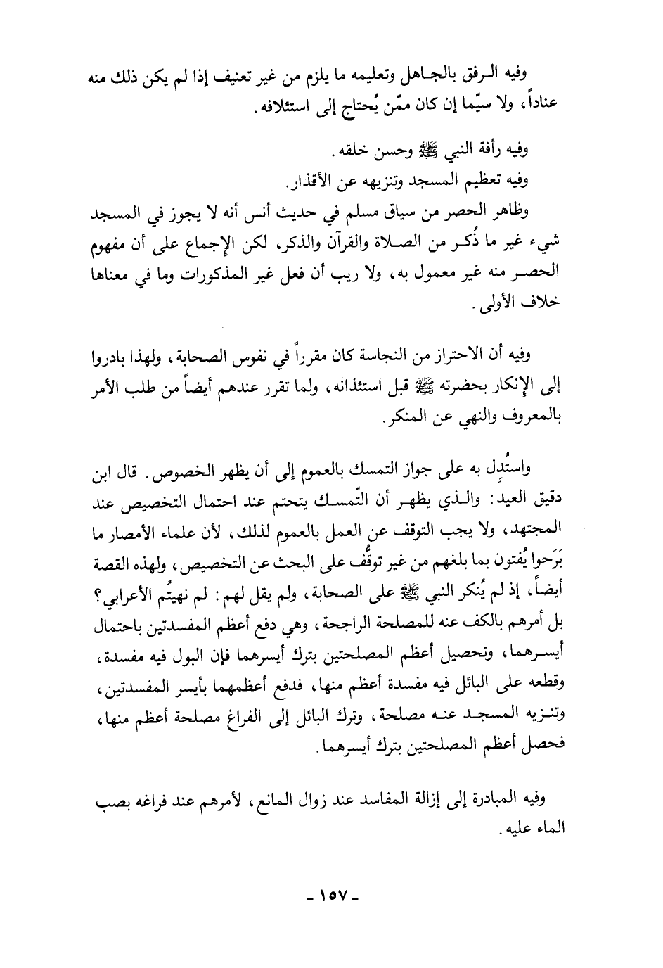 واستُدِل به على جواز التمسك بالعموم إلى أن يظهر الخصوص. قال ابن دقيق العيد: والذي يظهر أن التّمسك يتحتم عند احتمال التخصيص عند المجتهد، ولا يجب التوقف عن العمل بالعموم لذلك؛ لأن علماء الأمصار ما بَرَحوا يُفتون بما بلغهم من غير توقُّف على البحث عن التخصيص، ولهذه القصة أيضًا، إذ لم يُنكر النبي -صلى الله عليه وسلم- على الصحابة، ولم يقل لهم: لم نهيتُم الأعرابي؟ بل أمرهم بالكف عنه للمصلحة الراجحة، وهي دفع أعظم المفسدتين باحتمال أيسرهما، وتحصيل أعظم المصلحتين بترك أيسرهما فإن البول فيه مفسدة، وقطعه على البائل فيه مفسدة أعظم منها، فدفع أعظمهما بأيسر المفسدتين، وتنزيه المسجد عنه مصلحة، وترك البائل إلى الفراغ مصلحة أعظم منها، فحصل أعظم المصلحتين بترك أيسرهما.