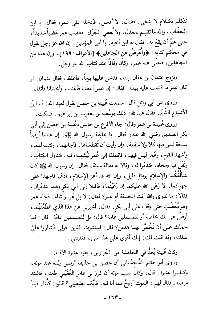 وروى عُبيدة بن عمر وقال: جاء الأقرع بن حابس وعُيينة بن حصن إلى أبي بكر الصديق رضي الله عنه، فقال: يا خليفة رسول الله -صلى الله عليه وسلم-: إن عندنا أرضًا سبخة ليس فيها كَلأ ولا منفعة، فإن رأيت أن تُقطعَناها. فأجابهما، وكتب لهما، وأشهد القوم، وعُمر ليس فيهم، فانطلقا إلى عُمر ليُشهداه فيه، فتناول الكتاب، وتَفَلَ فيه ومحاه، فتذمّرا له، وقالا له مقالة سيئة، فقال: إن رسول الله -صلى الله عليه وسلم- كان يتألَّفُكُما والإسلام يومئذٍ قليل، وإن الله قد أعزَّ الإِسلام، اذهَبا فاجهدا على جهدِكما، لا رَعَى الله عليكما إن رَعَيْتُما، فأقبلا إلى أبي بكرٍ وهما يتذمّران، فقالا: ما ندري والله أنت الخليفة أم عمر؟ فقال: لا بل هُو لو شاء. فجاء عمر وهو مُغْضَب حتى وقف على أبي بكرٍ، فقال: أخبرني عن هذا الذي اقطَعْتَهُما، أرضٌ هي لك خاصة أو للمسملين عامة؟ قال: بل للمسلمين عامّة. قال: فما حملك على أن تَخُصَّ بهما هذين؟ قال: استشرف الذين حولي فأشاروا عليَّ بذلك، وقد قلت لك: إنك أقوى على هذا مني، فغلبتني.