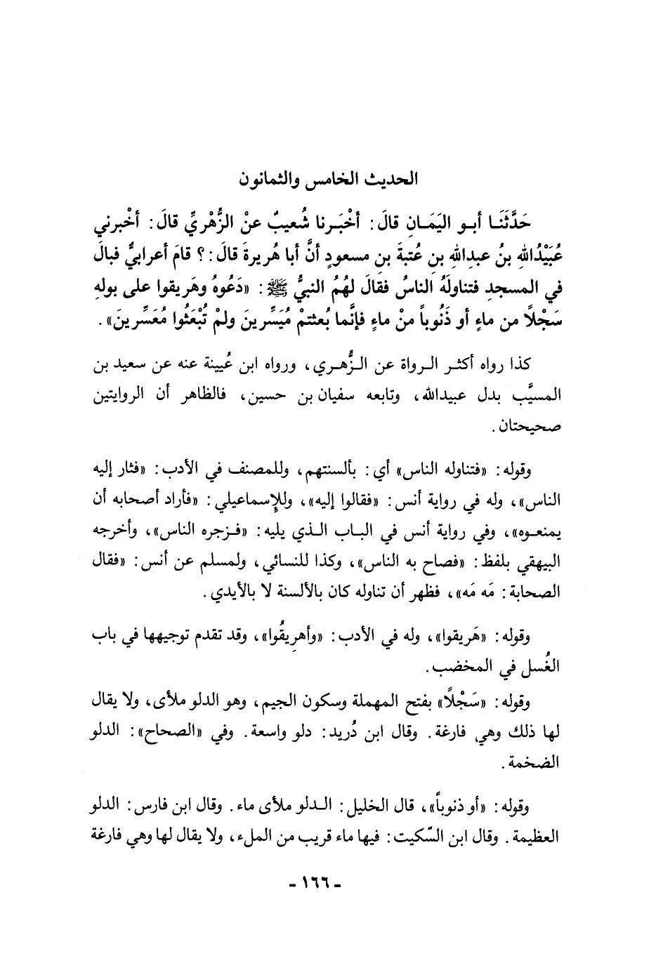 حَدَّثَنَا أَبُو الْيَمَانِ قَالَ: أَخْبَرَنَا شُعَيْبٌ عَنِ الزُّهْرِيِّ قَالَ: أَخْبَرَنِي عُبَيْدُ اللَّهِ بْنُ عَبْدِ اللَّهِ بْنِ عُتْبَةَ بْنِ مَسْعُودٍ أَنَّ أَبَا هُرَيْرَةَ قَالَ: قَامَ أَعْرَابِيٌّ فَبَالَ فِي الْمَسْجِدِ فَتَنَاوَلَهُ النَّاسُ، فَقَالَ لَهُمُ النَّبِيُّ -صلى الله عليه وسلم-: "دَعُوهُ وَهَرِيقُوا عَلَى بَوْلِهِ سَجْلاً مِنْ مَاءٍ، أَوْ ذَنُوبًا مِنْ مَاءٍ، فَإِنَّمَا بُعِثْتُمْ مُيَسِّرِينَ، وَلَمْ تُبْعَثُوا مُعَسِّرِينَ".