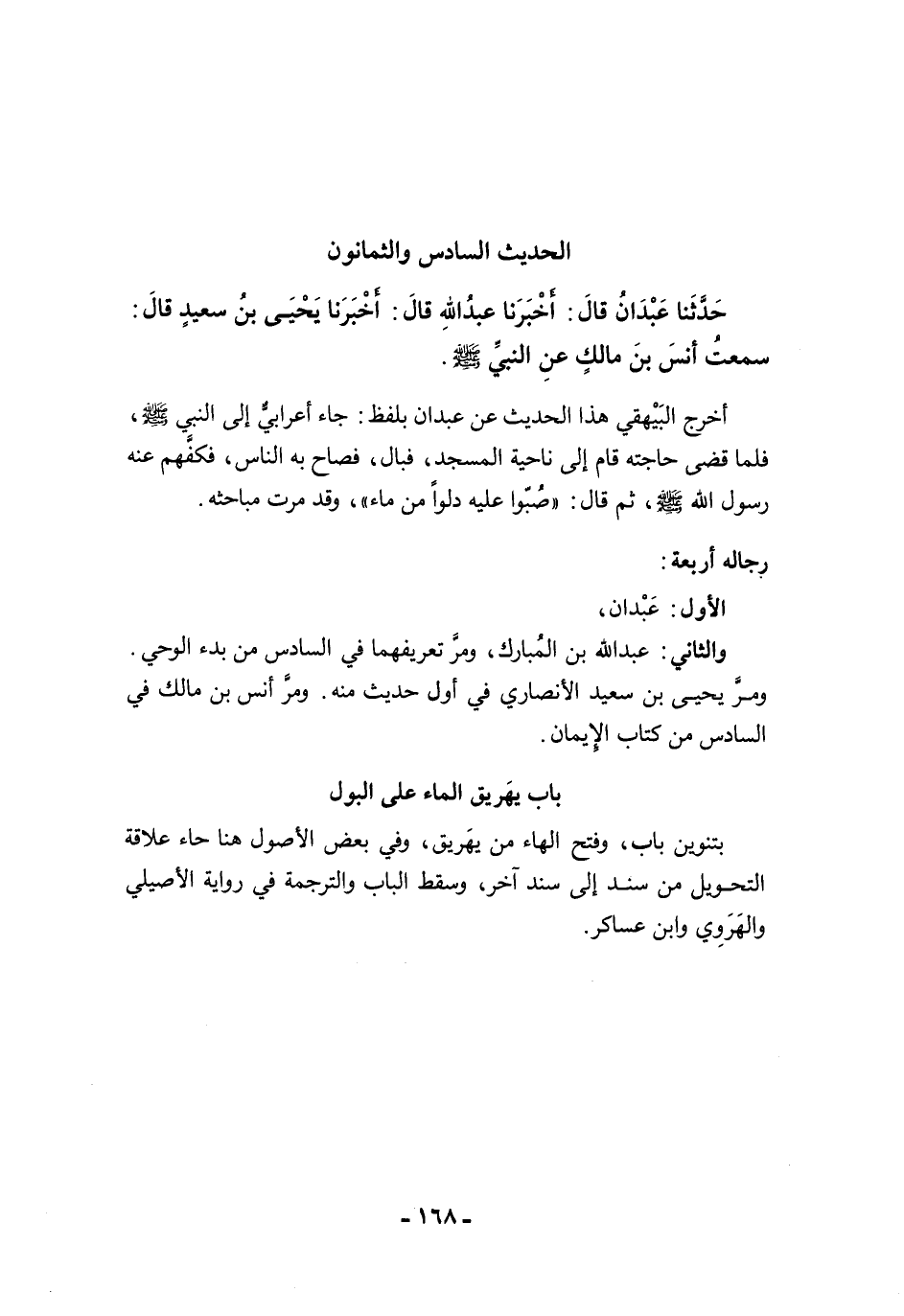 أخرج البَيْهقي هذا الحديث عن عبدان بلفظ: جاء أعرابيٌّ إلى النبي -صلى الله عليه وسلم-، فلما قضى حاجته قام إلى ناحية المسجد، فبال، فصاح به الناس، فكفَّهم عنه رسول الله -صلى الله عليه وسلم-، ثم قال: "صُبُّوا عليه دلوًا من ماء"، وقد مرت مباحثه.