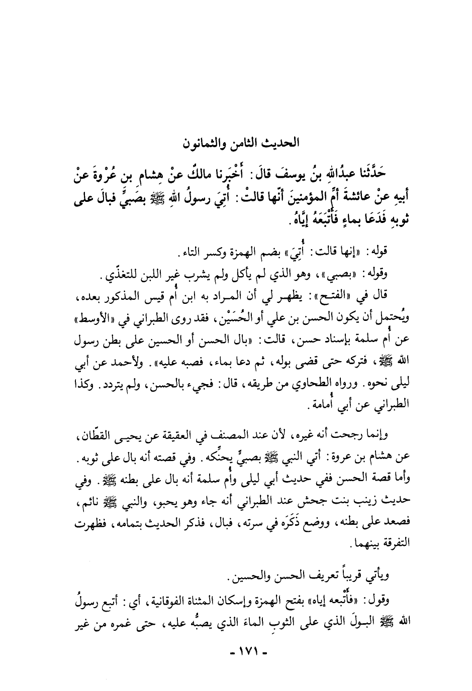 وإنما رجحت أنه غيره؛ لأن عند المصنف في العقيقة عن يحيى القطّان، عن هشام بن عروة: أتي النبي -صلى الله عليه وسلم- بصبيٍّ يحنِّكه. وفي قصته أنه بال على ثوبه. وأما قصة الحسن ففي حديث أبي ليلى وأُم سلمة أنه بال على بطنه -صلى الله عليه وسلم-. وفي حديث زينب بنت جحش عند الطبراني أنه جاء وهو يحبو، والنبي -صلى الله عليه وسلم- نائم، فصعد على بطنه، ووضع ذَكَرَه في سرته، فبال، فذكر الحديث بتمامه، فظهرت التفرقة بينهما.