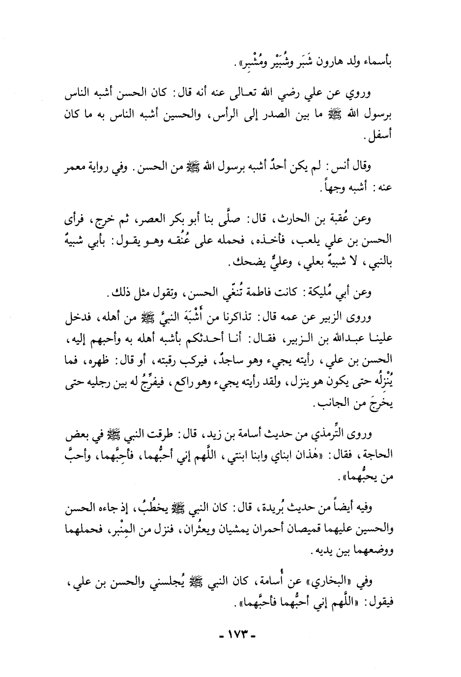 وروى الزبير عن عمه قال: تذاكرنا من أَشْبَهَ النبيَّ -صلى الله عليه وسلم- من أهله، فدخل علينا عبد الله بن الزبير، فقال: أنا أحدثكم بأشبه أهله به وأحبهم إليه، الحسن بن علي، رأيته يجيء وهو ساجدٌ، فيركب رقبته، أو قال: ظهره، فما يُنْزِلُه حتى يكون هو ينزل، ولقد رأيته يجيء وهو راكع، فيفرِّجُ له بين رجليه حتى يخرجَ من الجانب.