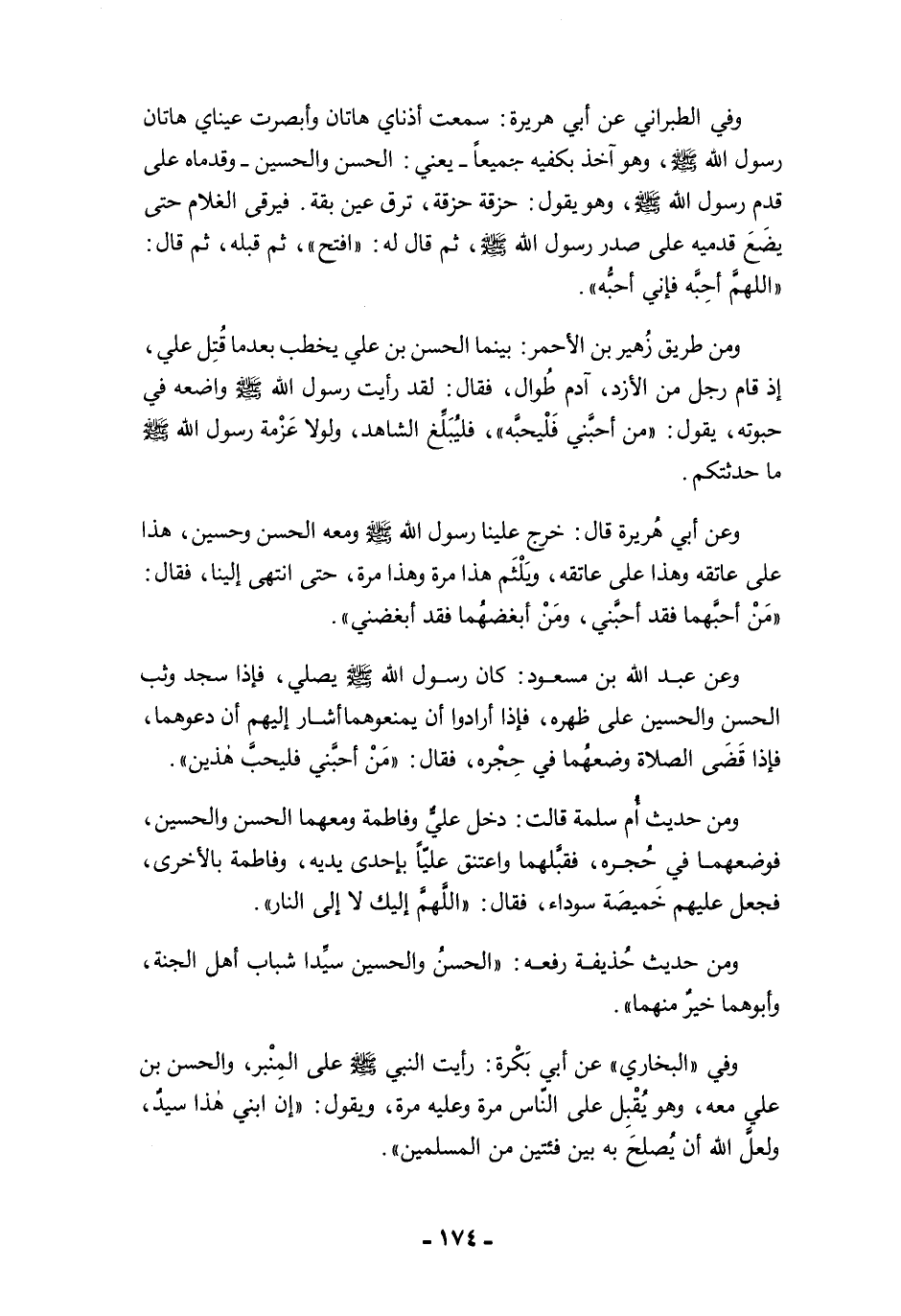 وعن عبد الله بن مسعود: كان رسول الله -صلى الله عليه وسلم- يصلي، فإذا سجد وثب الحسن والحسين على ظهره، فإذا أرادوا أن يمنعوهما أشار إليهم أن دعوهما، فإذا قَضَى الصلاة وضعهُما في حِجْره، فقال: "مَنْ أحبَّني فليحبَّ هذين".