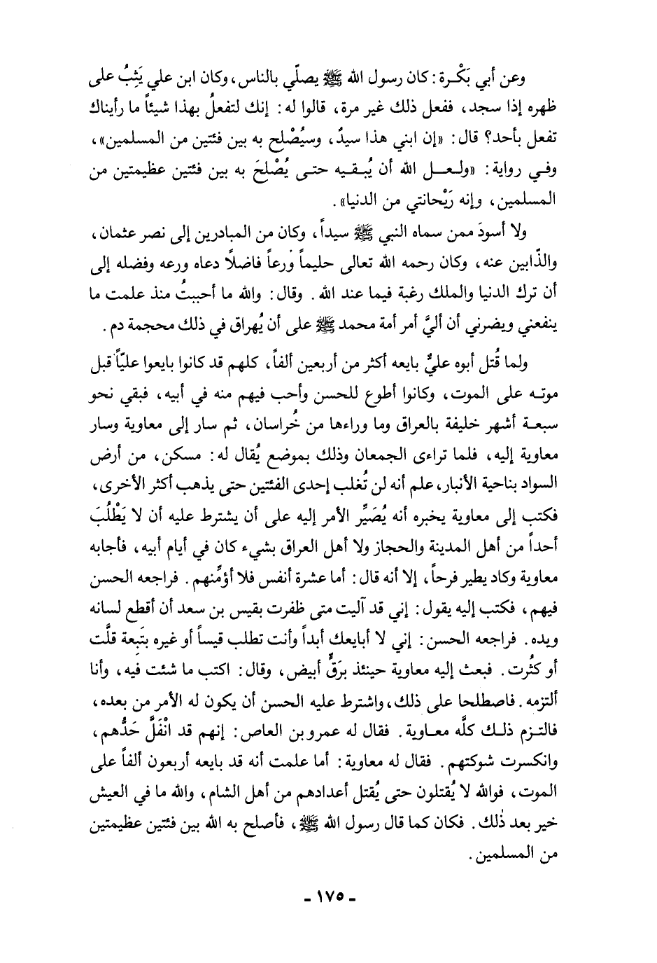 وعن أبي بَكْرة: كان رسول الله -صلى الله عليه وسلم- يصلّي بالناس، وكان ابن علي يَثِبُ على ظهره إذا سجد، ففعل ذلك غير مرة، قالوا له: إنك لتفعلُ بهذا شيئًا ما رأيناك تفعل بأحد؟ قال: "إن ابني هذا سيدٌ، وسيُصْلح به بين فئتين من المسلمين"، وفي رواية: "ولعل الله أن يُبقيه حتى يُصْلحَ به بين فئتين عظيمتين من المسلمين، وإنه رَيْحانتي من الدنيا".
