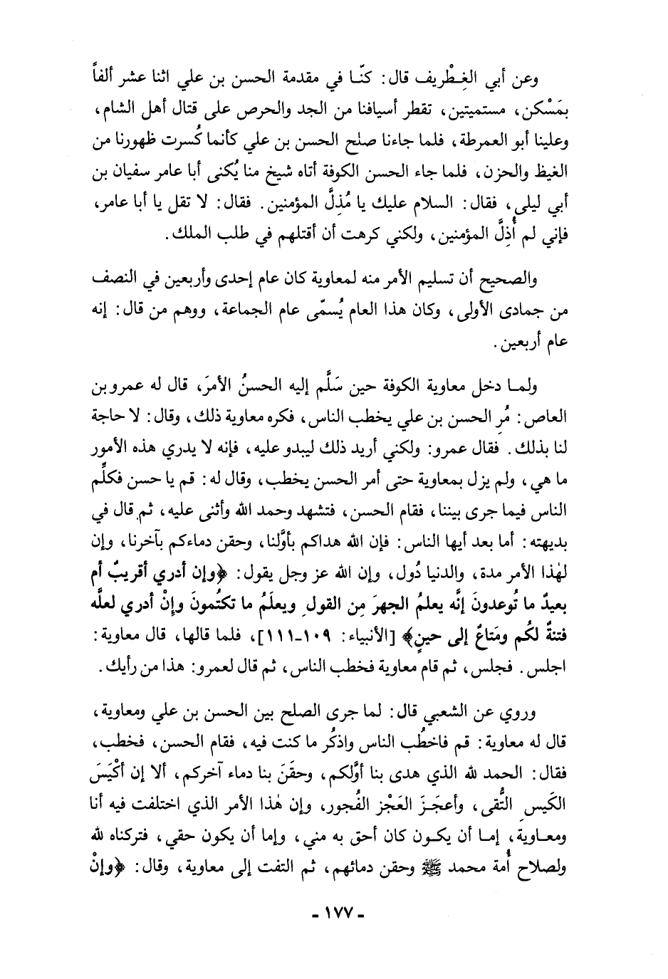 وروي عن الشعبي قال: لما جرى الصلح بين الحسن بن علي ومعاوية، قال له معاوية: قم فاخطُب الناس واذكُر ما كنت فيه، فقام الحسن، فخطب، فقال: الحمد لله الذي هدى بنا أوَّلكم، وحقَنَ بنا دماء آخركم، ألا إن أكْيَسَ الكَيسِ التُّقى، وأعجَزَ العَجْز الفُجور، وإن هذا الأمر الذي اختلفت فيه أنا ومعاوية، إما أن يكون كان أحق به مني، وإما أن يكون حقي، فتركناه لله ولصلاح أُمة محمد -صلى الله عليه وسلم- وحقن دمائهم، ثم التفت إلى معاوية، وقال: {وَإِنْ