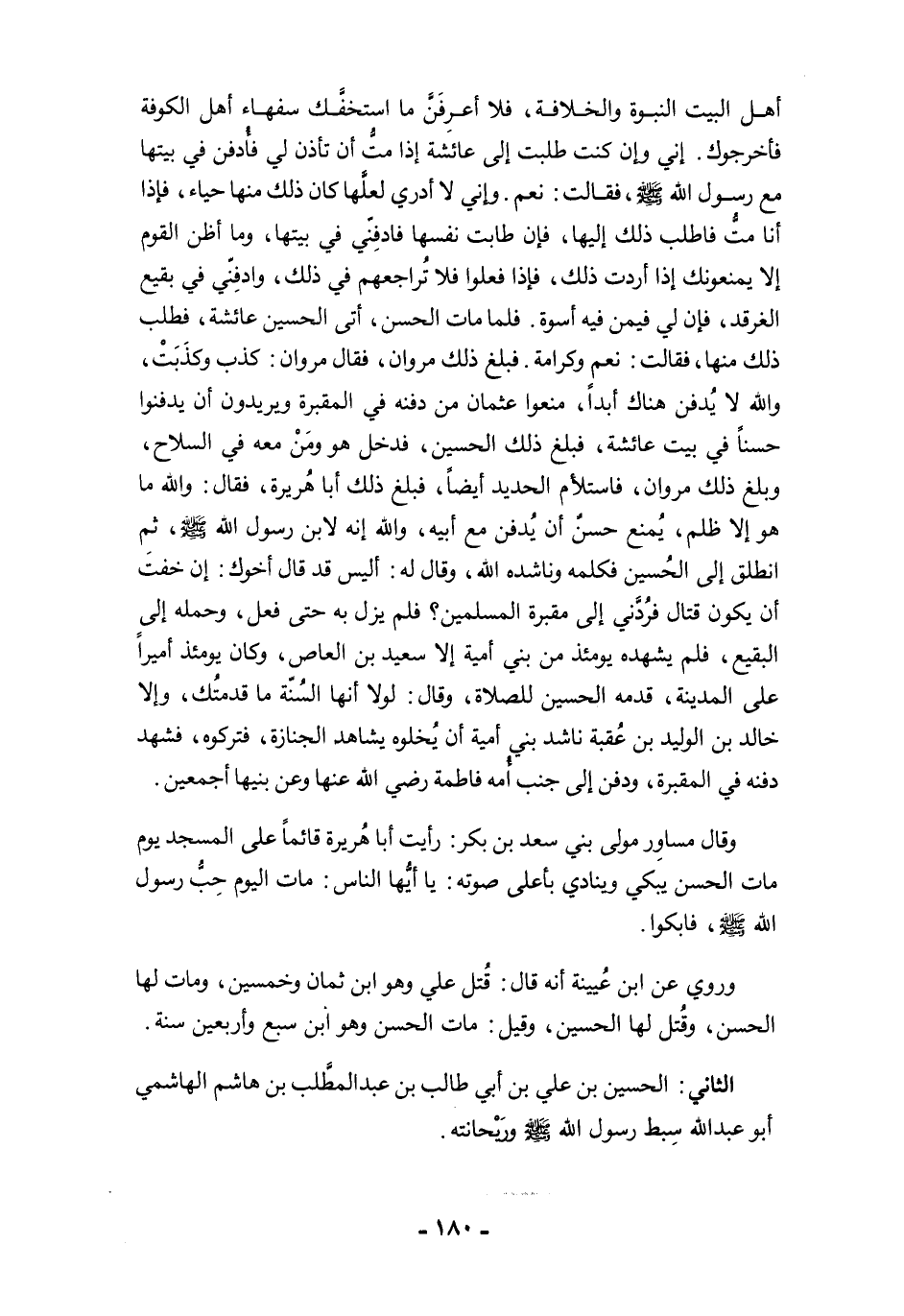 أهل البيت النبوة والخلافة، فلا أعرِفَنَّ ما استخفَّك سفهاء أهل الكوفة فأخرجوك. إني وإن كنت طلبت إلى عائشة إذا متُّ أن تأذن لي فأُدفن في بيتها مع رسول الله -صلى الله عليه وسلم-، فقالت: نعم. وإني لا أدري لعلَّها كان ذلك منها حياء، فإذا أنا متُّ فاطلب ذلك إليها، فإن طابت نفسها فادفِنّي في بيتها، وما أظن القوم إلا يمنعونك إذا أردت ذلك، فإذا فعلوا فلا تُراجعهم في ذلك، وادفِنّي في بقيع الغرقد، فإن لي فيمن فيه أسوة. فلما مات الحسن، أتى الحسين عائشة، فطلب ذلك منها، فقالت: نعم وكرامة. فبلغ ذلك مروان، فقال مروان: كذب وكذَبَتْ، والله لا يُدفن هناك أبدًا، منعوا عثمان من دفنه في المقبرة ويريدون أن يدفنوا حسنًا في بيت عائشة، فبلغ ذلك الحسين، فدخل هو ومَنْ معه في السلاح، وبلغ ذلك مروان، فاستلأم الحديد أيضًا، فبلغ ذلك أبا هُريرة، فقال: والله ما هو إلا ظلم، يُمنع حسنٌ أن يُدفن مع أبيه، والله إنه لابن رسول الله -صلى الله عليه وسلم-، ثم انطلق إلى الحُسين فكلمه وناشده الله، وقال له: أليس قد قال أخوك: إن خفت أن يكون قتال فرُدَّني إلى مقبرة المسلمين؟ فلم يزل به حتى فعل، وحمله إلى البقيع، فلم يشهده يومئذ من بني أمية إلا سعيد بن العاص، وكان يومئذ أميرًا على المدينة، قدمه الحسين للصلاة، وقال: لولا أنها السُنّة ما قدمتُك، وإلا خالد بن الوليد بن عُقبة ناشد بني أمية أن يُخلوه يشاهد الجنازة، فتركوه، فشهد دفنه في المقبرة، ودفن إلى جنب أُمه فاطمة رضي الله عنها وعن بنيها أجمعين.