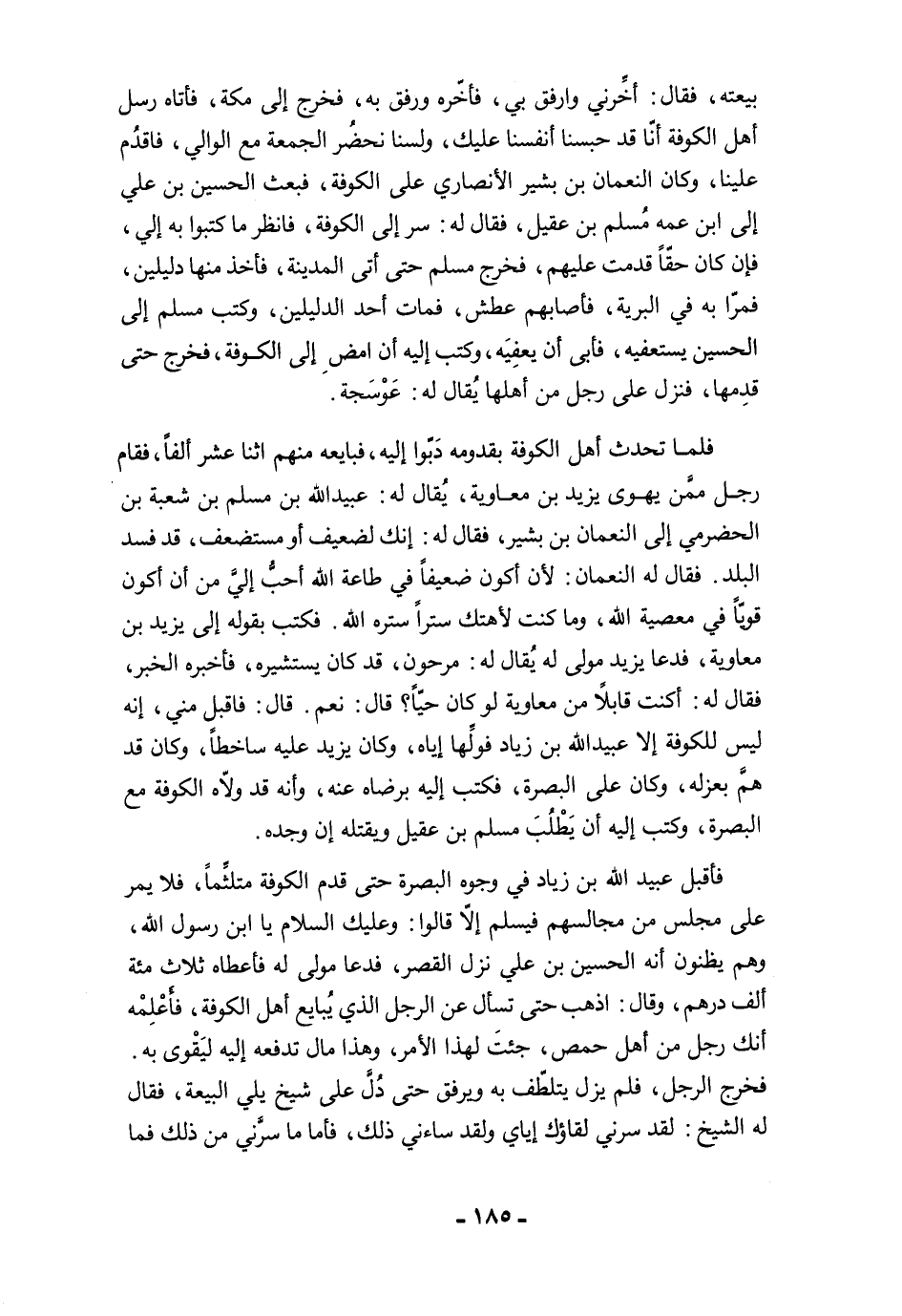 بيعته، فقال: أخِّرني وارفق بي، فأخّره ورفق به، فخرج إلى مكة، فأتاه رسل أهل الكوفة أنّا قد حبسنا أنفسنا عليك، ولسنا نحضُر الجمعة مع الوالي، فاقدُم علينا، وكان النعمان بن بشير الأنصاري على الكوفة، فبعث الحسين بن علي إلى ابن عمه مُسلم بن عقيل، فقال له: سر إلى الكوفة، فانظر ما كتبوا به إلى، فإن كان حقًّا قدمت عليهم، فخرج مسلم حتى أتى المدينة، فأخذ منها دليلين، فمرّا به في البرية، فأصابهم عطش، فمات أحد الدليلين، وكتب مسلم إلى الحسين يستعفيه، فأبى أن يعفِيَه، وكتب إليه أن امضِ إلى الكوفة، فخرج حتى قدِمها، فنزل على رجل من أهلها يُقال له: عَوْسَجة.