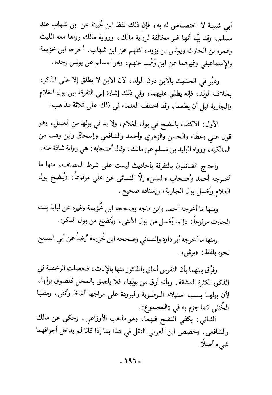 الأول: الاكتفاء بالنضح في بول الغلام، ولابد في بولها من الغسل، وهو قول علي وعطاء والحسن والزهري وأحمد والشافعي وإسحاق وابن وهب من المالكية، ورواه الوليد بن مسلم عن مالك، وقال أصحابه: هي رواية شاذة عنه.