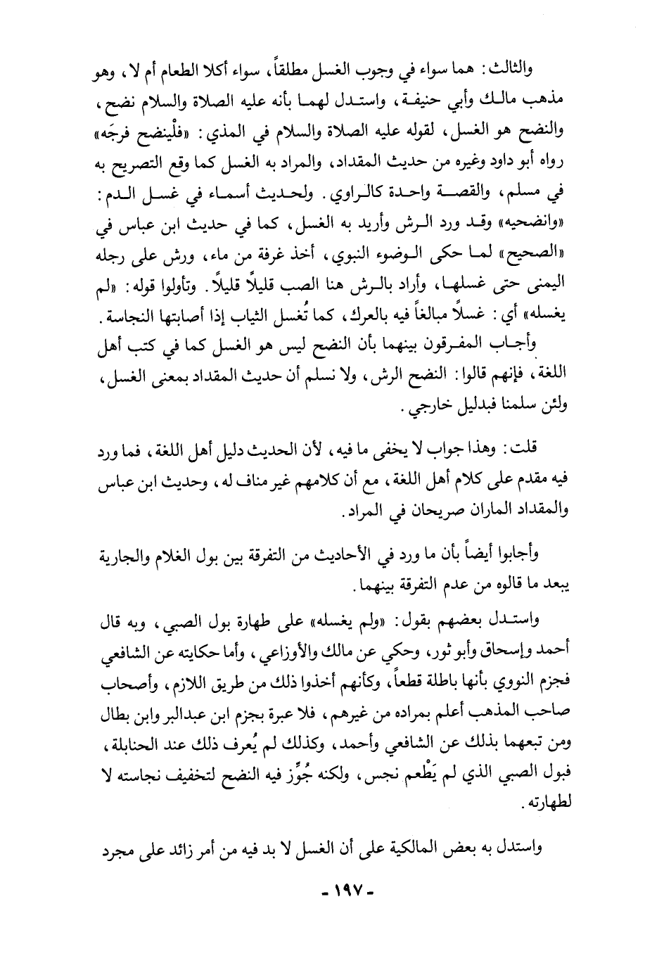 وأجاب المفرقون بينهما بأن النضح ليس هو الغسل كما في كتب أهل اللغة، فإنهم قالوا: النضح الرش، ولا نسلم أن حديث المقداد بمعنى الغسل، ولئن سلمنا فبدليل خارجي.
